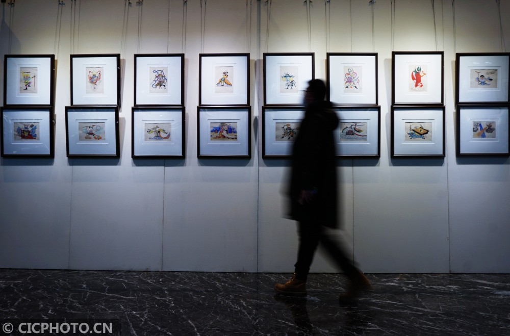 ↑观众在浙江省杭州市举办的一场拍卖会预展上观看《大闹天宫》动画设计稿。CICPHOTO/龙巍 摄