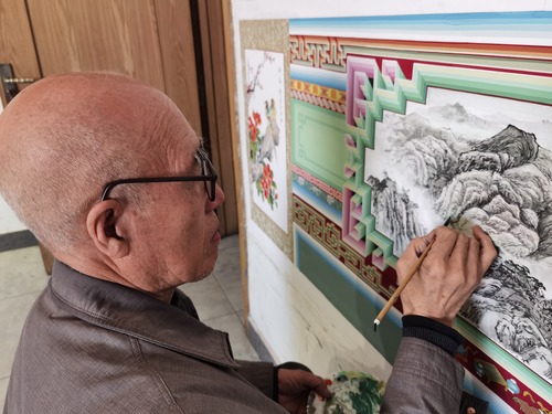 炕围画省级非遗传承人弓进寿正在绘制炕围画。 新华社记者刘翔霄摄