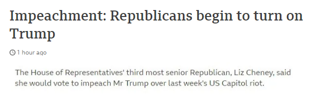 多名共和党议员,甚至曾经的特朗普追随者,如今也转变了立场。一个共和党人组成的团体已经向众议院递交一份决议,谴责总统特朗普试图推翻大选结果以及煽动示威者闯入国会。此外,已有至少三名共和党众议员表态支持弹劾特朗普,包括众议院共和党“三号人物”、前副总统切尼的女儿——利兹·切尼。