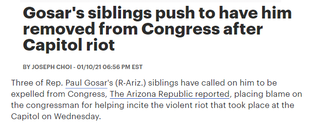 据美国《国会山报》报道,冲击国会事件后,亚利桑那州议员保罗·戈萨的几个兄弟姐妹一起致信国会,请求将他们的兄弟“赶出国会”,因为他参与煽动了发生在国会大厦内的暴力活动。