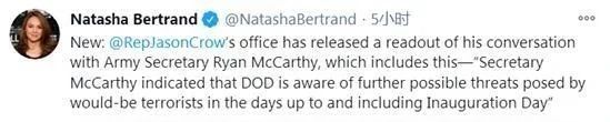 现实确实不容乐观。美国陆军部长莱恩·麦卡锡日前在与联邦众议员贾森·克罗的对话中表示,美国国防部意识到,当选总统就职之前甚至就职日当天,潜在的“恐怖分子”可能会制造更多威胁,华盛顿可能再次发生暴力事件。