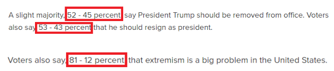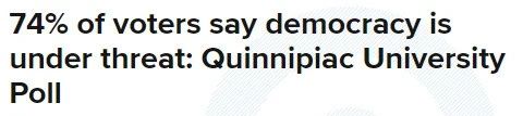 美国昆尼皮亚克大学所做的一项最新民调显示,目前有74%的美国选民认为这个国家的民主制度正在受到威胁。支持总统特朗普被免职或辞职的分别占52%和53%,反对者则分别占45%和43%,这一对比显示美国社会仍存在着巨大的分裂鸿沟。但可以确认的是,高达81%的选民认为极端主义在美国已成了一个“大问题”,美国正在分化的道路上越走越远。
