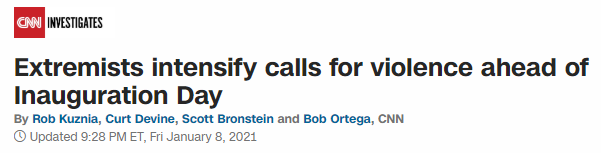 △美国有线电视新闻网(CNN):极端分子加紧号召在新总统就职日之前制造暴力事件。