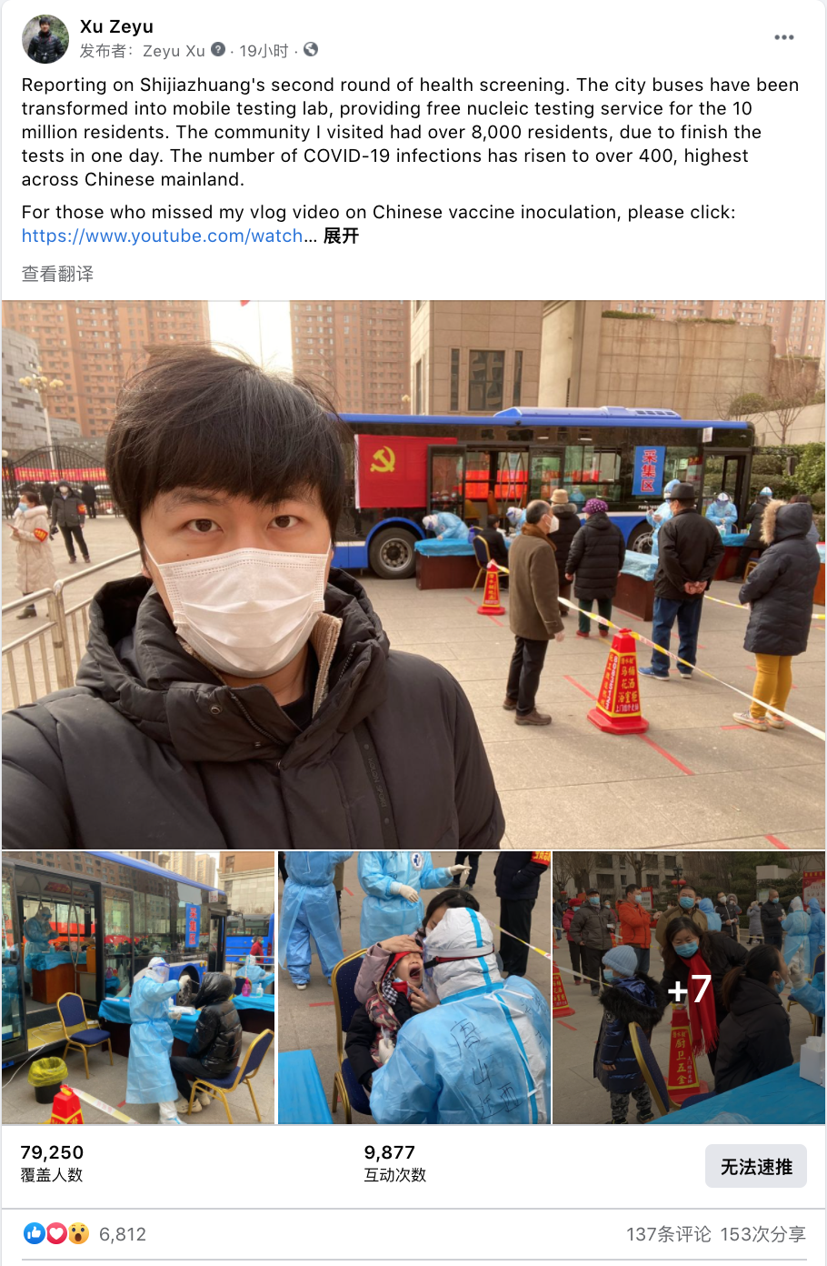 记者在贴文中写道:“我正在报道石家庄第二次全员核酸检测,全市1000多万人将进行免费的核酸检测,公交车也变身‘核酸采样流动车’。我来到的这个社区有8000多名居民,计划一天内完成采样。”