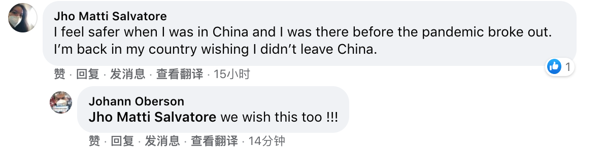 有旅居中国的海外网友在疫情暴发后回国了,但也没逃过“真香定律”:“在全球大流行暴发之前我还在中国,那时候感觉安全多了。我现在回到了自己的国家,但真希望自己当初没离开中国。”