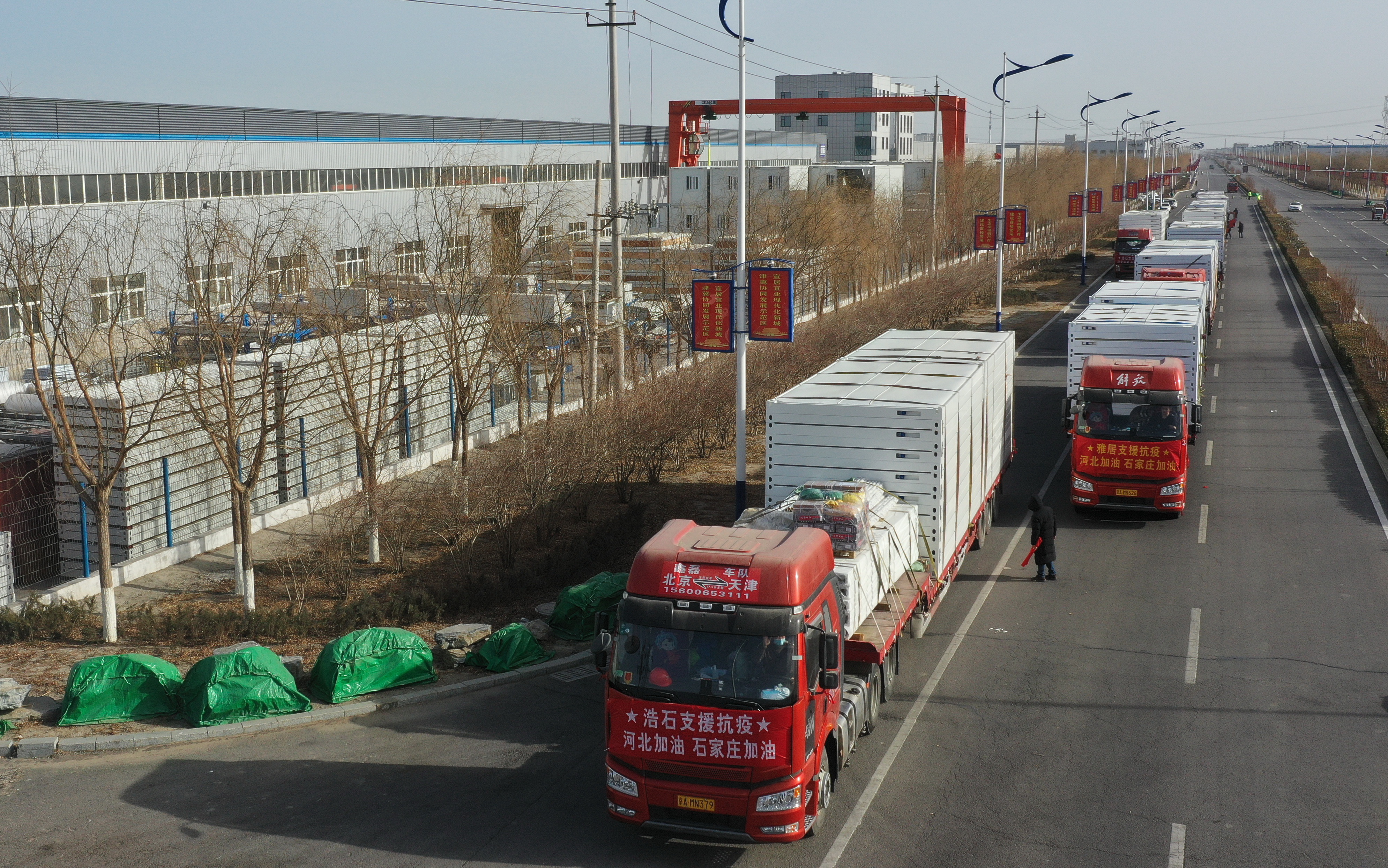 图为装载集成房屋部件的车辆准备驶向石家庄