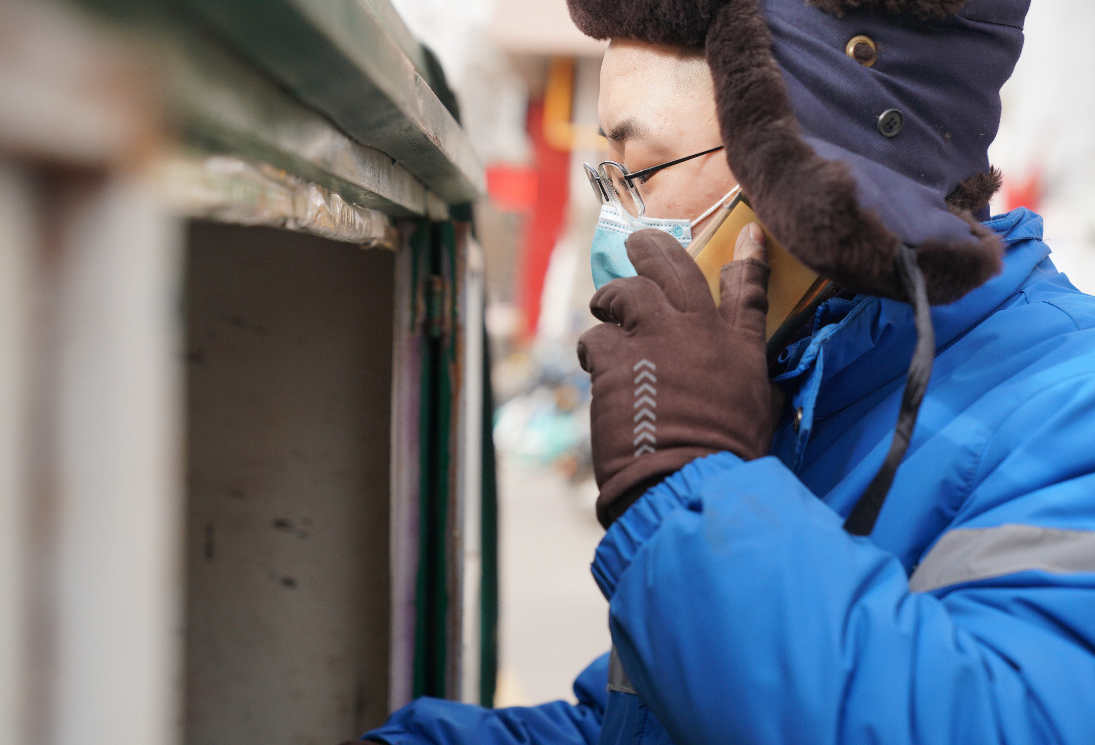 1月13日,快递员李雅昆在石家庄市新华区一居民小区门前给收件人打电话。