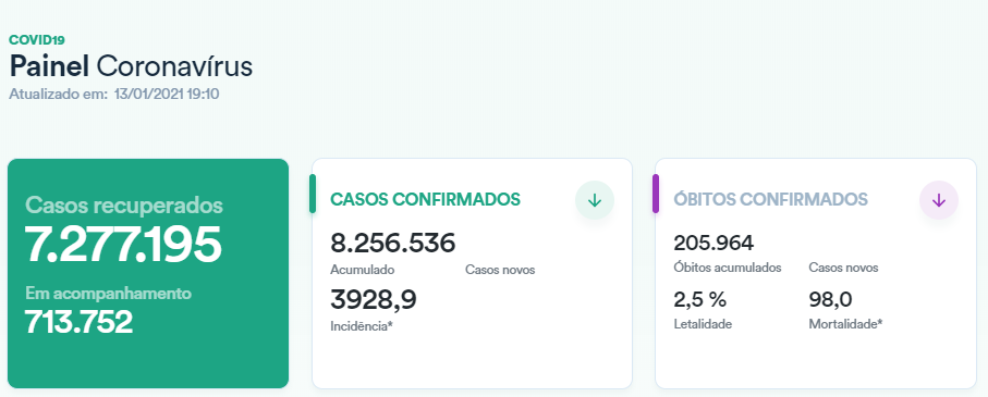 截至当地时间1月13日,据巴西卫生部发布的数据,该国新冠肺炎累计确诊病例达到8256536例,单日新增确诊病例达60899例,单日新增死亡病例达1274例,累计死亡病例205964例。累计治愈人数7277195人。