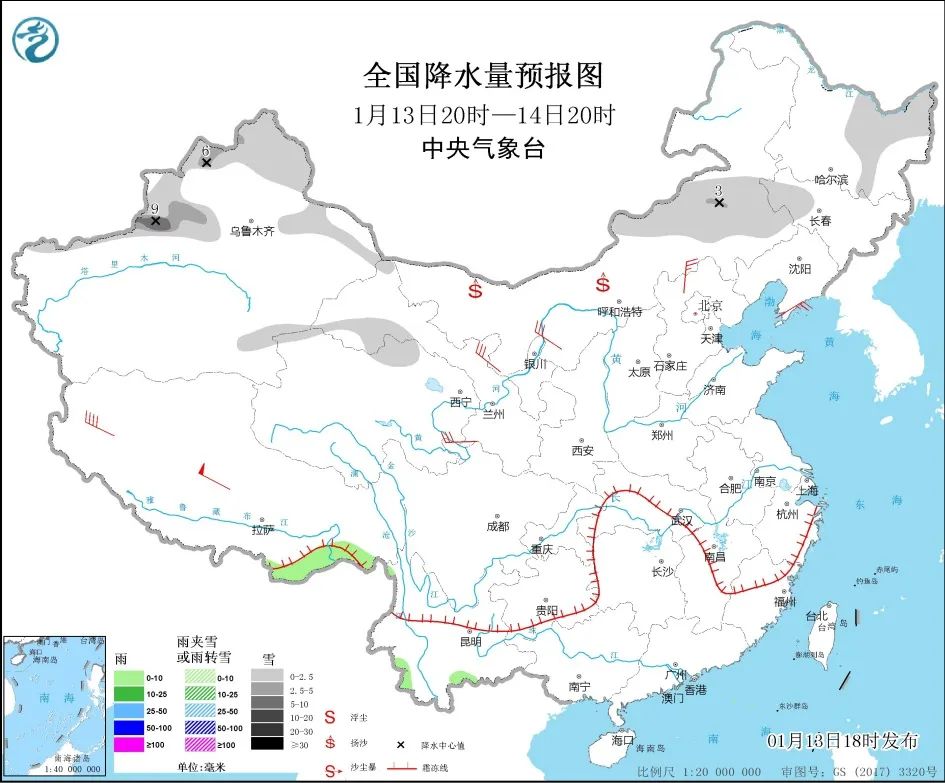 13日20时至14日20时,新疆北部、甘肃河西、内蒙古东部、黑龙江东北部、吉林西部等地的部分地区有小到中雪。西藏东南部、云南南部等地的部分地区有小雨或阵雨。