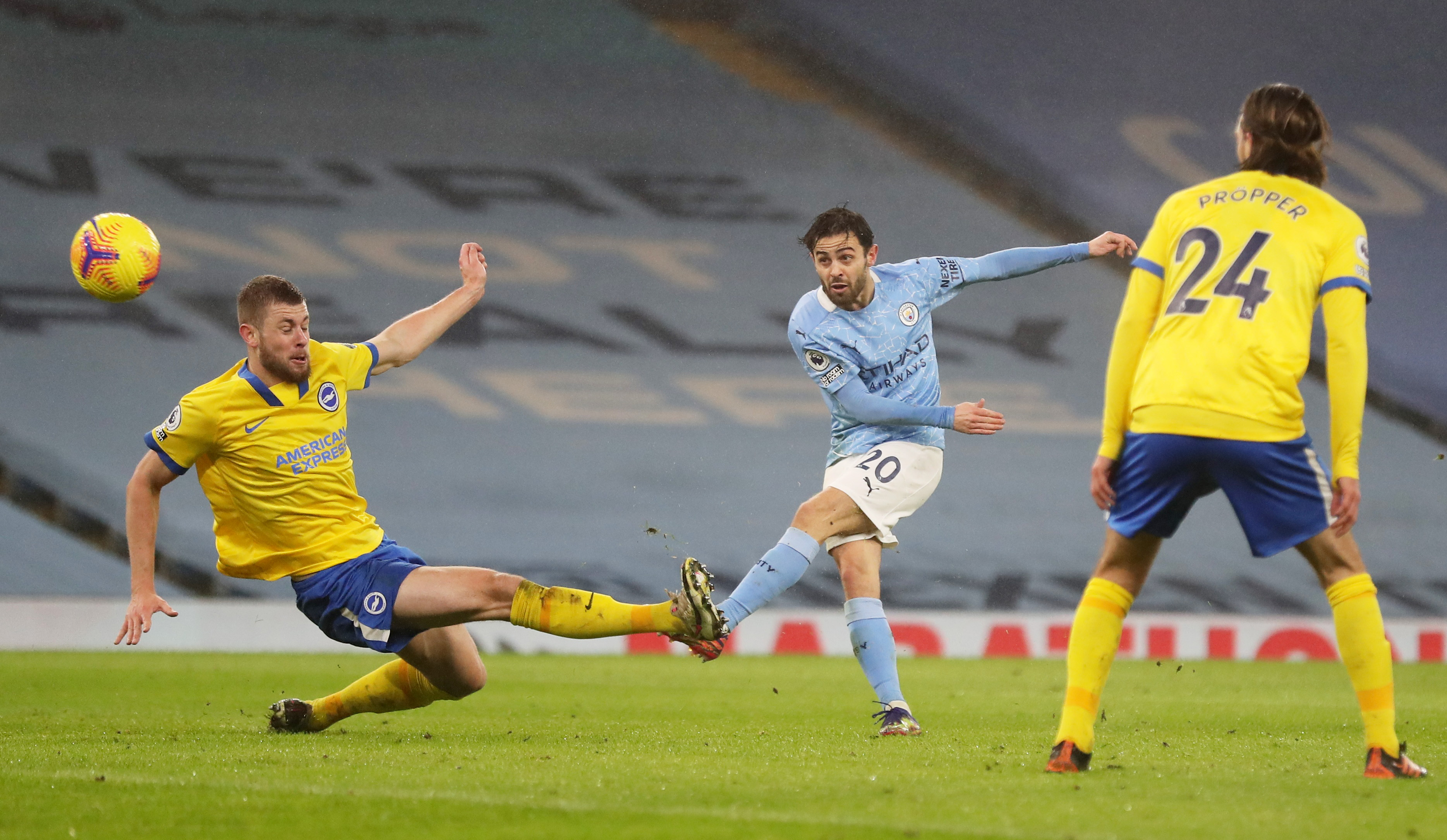1月13日,曼城队球员贝尔纳多·席尔瓦(中)射门。