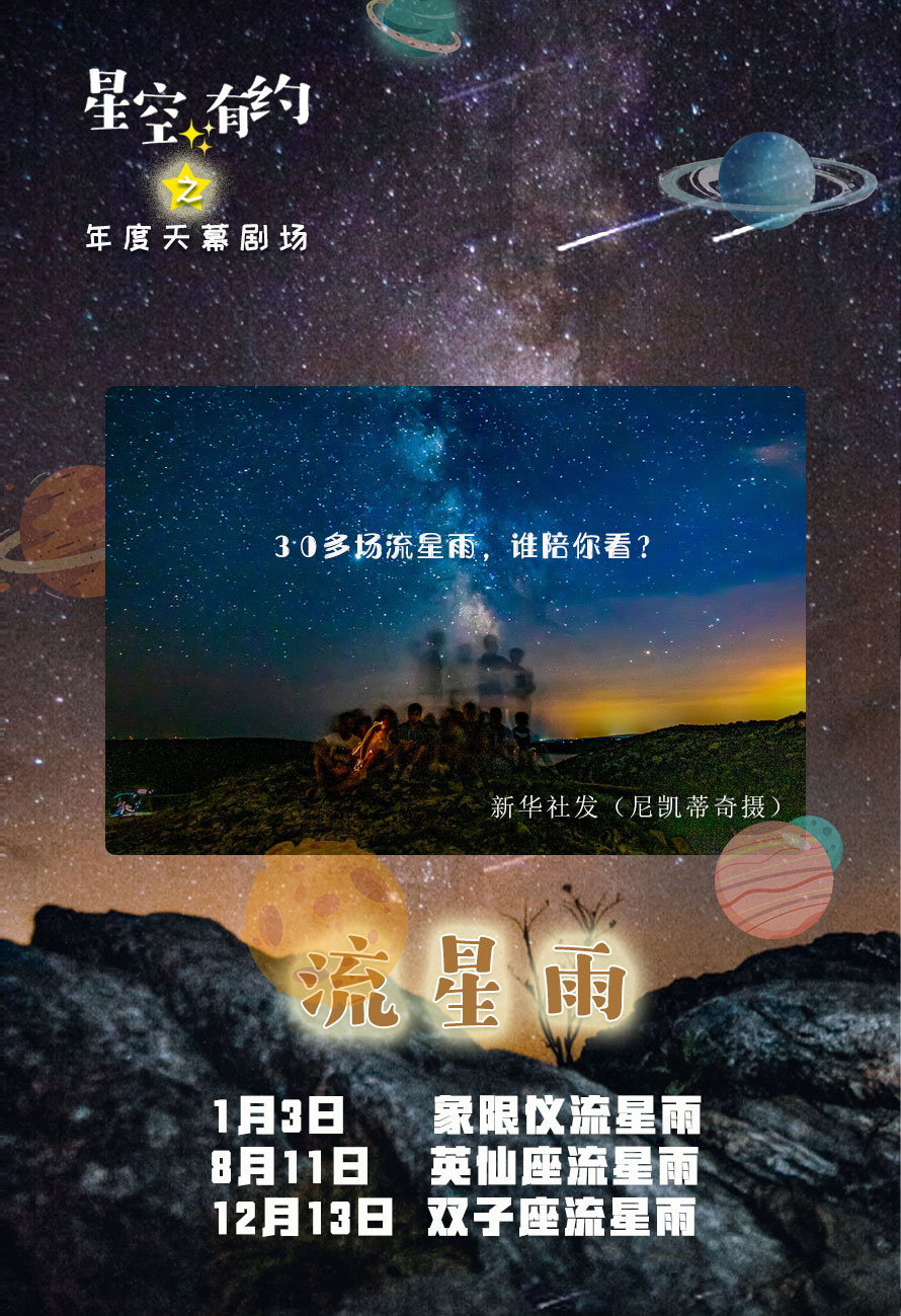 2021年的流星雨有30多场,其中最值得关注的是北半球三大流星雨。除了1月3日已经上演的象限仪流星雨,另两场分别是8月11日至12日夜达到峰值的英仙座流星雨和12月13日至14日夜达到峰值的双子座流星雨。这两场流星雨ZHR(极大时假设辐射点位于天顶的每小时流量)分别能到100颗和150颗左右,还可能会有明亮的火流星划过天空,非常精彩。