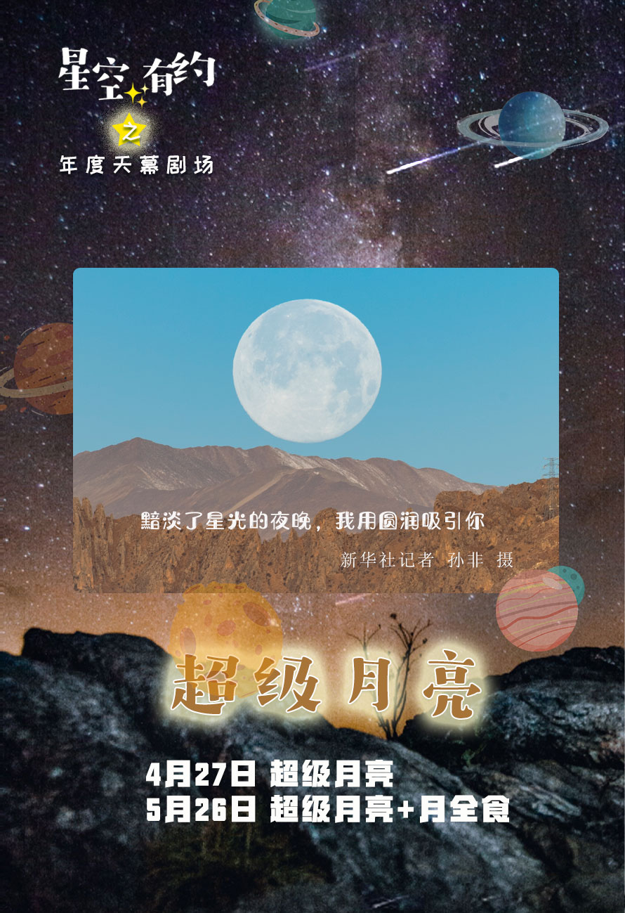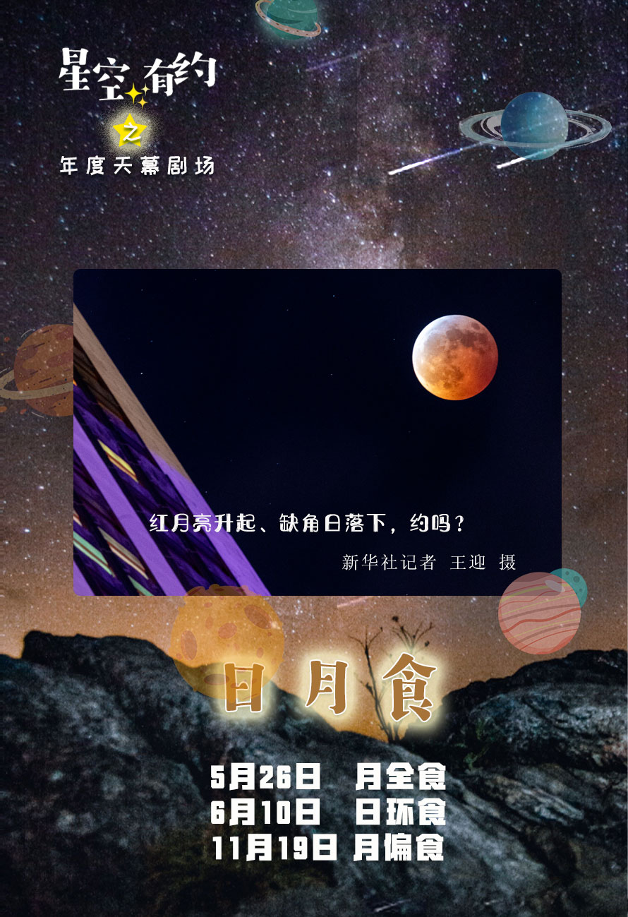 紫金山天文台科普部主管胡方浩介绍,今年的3场日月食是“重头戏”。据紫金山天文台预报,5月26日将上演月全食,17时45分左右开始,整个过程持续约3小时8分。此次月食恰逢“超级月亮”,我国大部分地区可以看到“带食月升”的景象。如果天气晴好,有的地区能看到一轮红月亮跃出地平线,有的地区则能看到一轮“缺角月”冉冉升起。