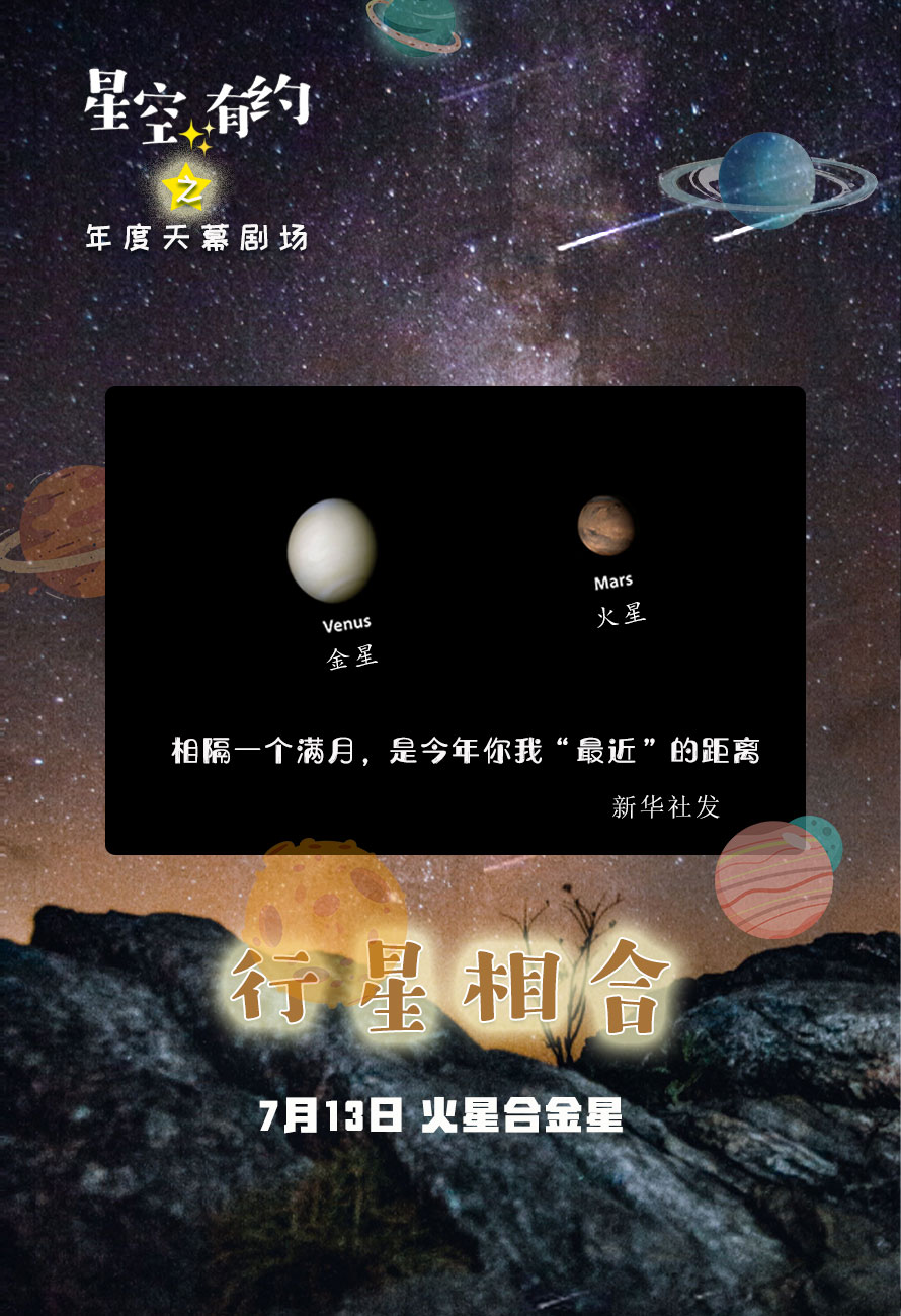 此外,7月13日15点左右还将上演火星合金星,此时两颗行星间的视距离仅0.5度。日落之后,公众可以看到金星和火星相距很近。肉眼看去,两颗行星仅相隔约一个满月直径的距离。