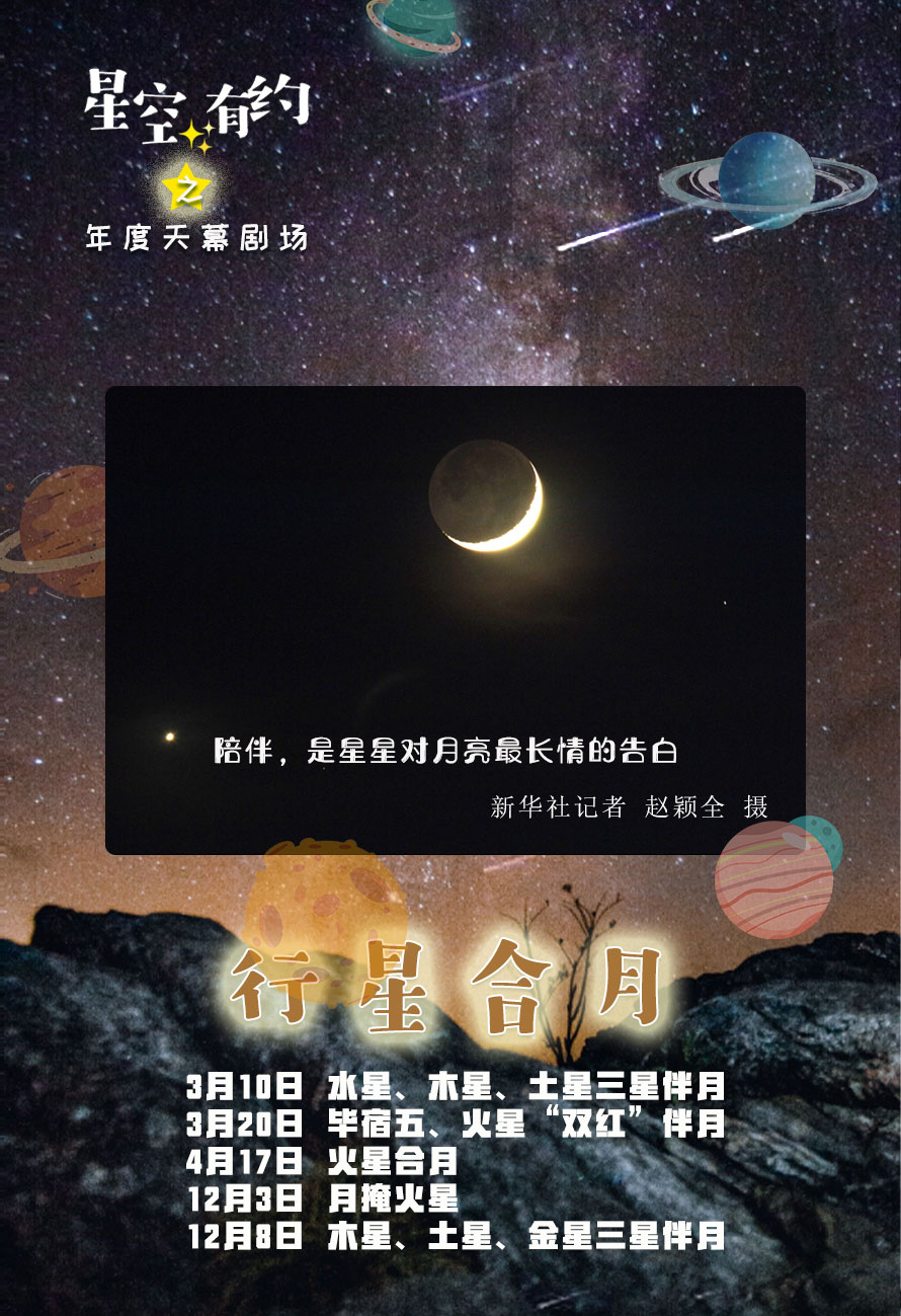 行星合月天象较多,有时还会出现多星伴月、月掩火星的特殊景象。3月20日火星合月,当晚火星与恒星毕宿五两颗“红星”会与月亮相伴,稍远处还有另一颗“红星”参宿四,公众有望目睹三颗红星与月亮“同框”。12月3日火星合月,当日黎明前,公众可见月球与火星逐渐靠近,在酒泉等地区,清晨时还能看到月掩火星的情景。