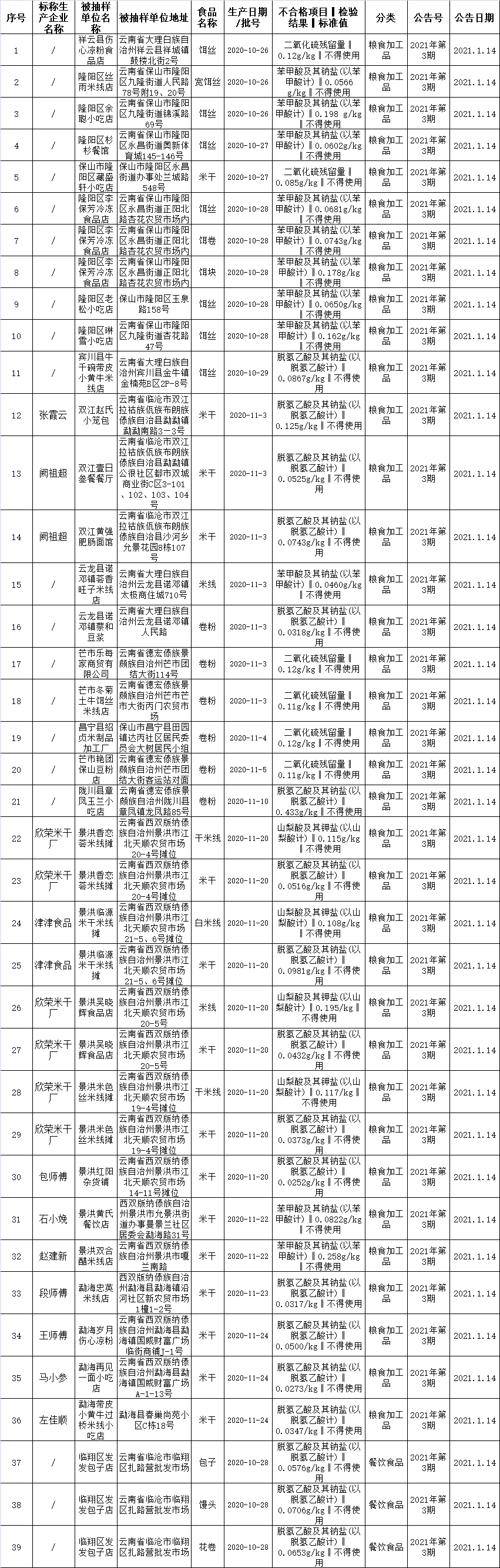 昨日(14日),云南省市场监督管理局对外发布了云南省食品安全监督抽检信息通告。2020年依据有关食品安全国家标准检验,对2193批次米面制品(含网络订餐)专项抽检,检出不合格样品39批次,总体不合格率为1.78%。从检出的不合格项目类别看,全部为食品添加剂超范围使用问题。