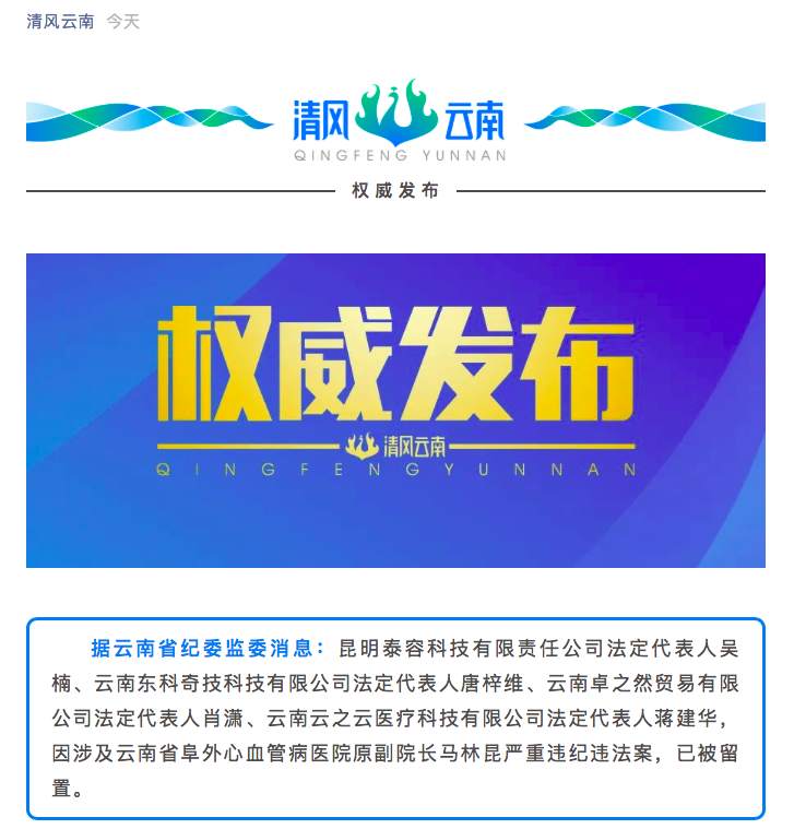 据“清风云南”微信公众号通报,昆明泰容科技有限责任公司法定代表人吴楠、云南东科奇技科技有限公司法定代表人唐梓维、云南卓之然贸易有限公司法定代表人肖潇、云南云之云医疗科技有限公司法定代表人蒋建华,因涉及云南省阜外心血管病医院原副院长马林昆严重违纪违法案,已被留置。