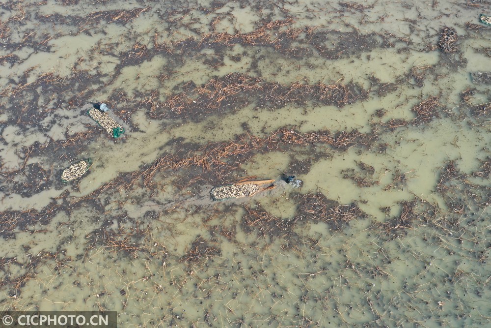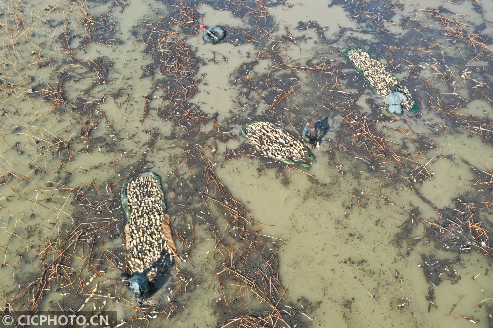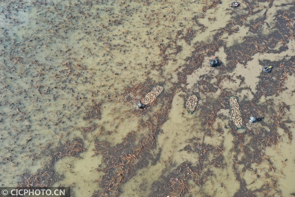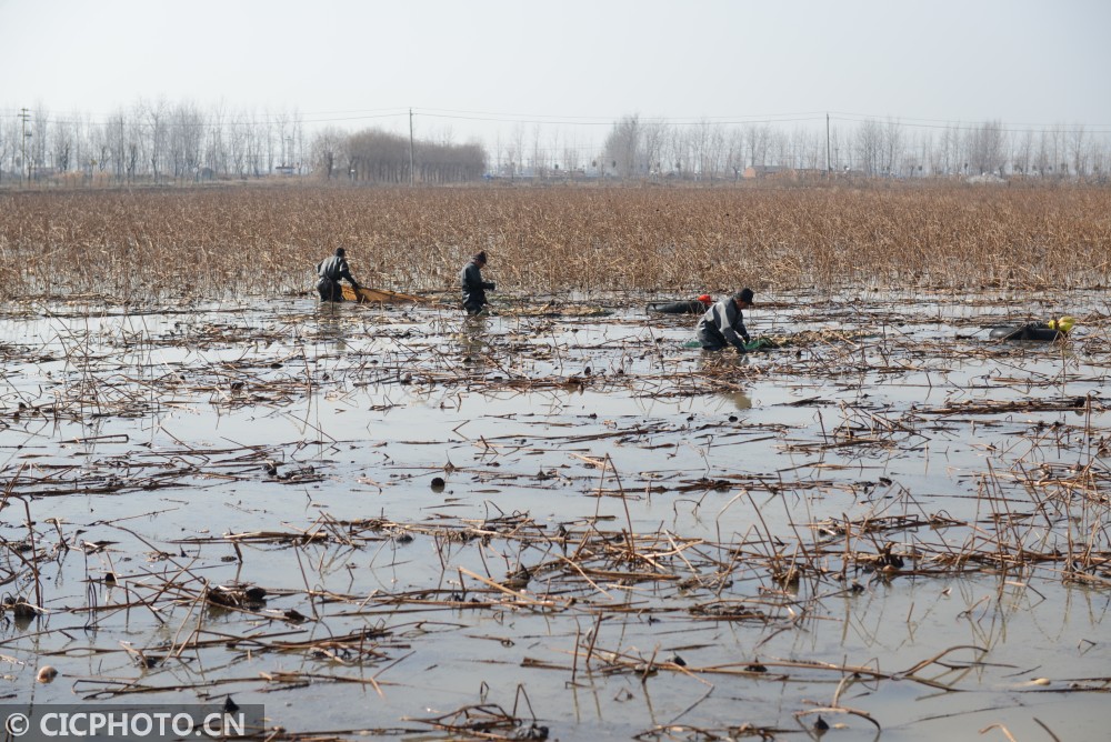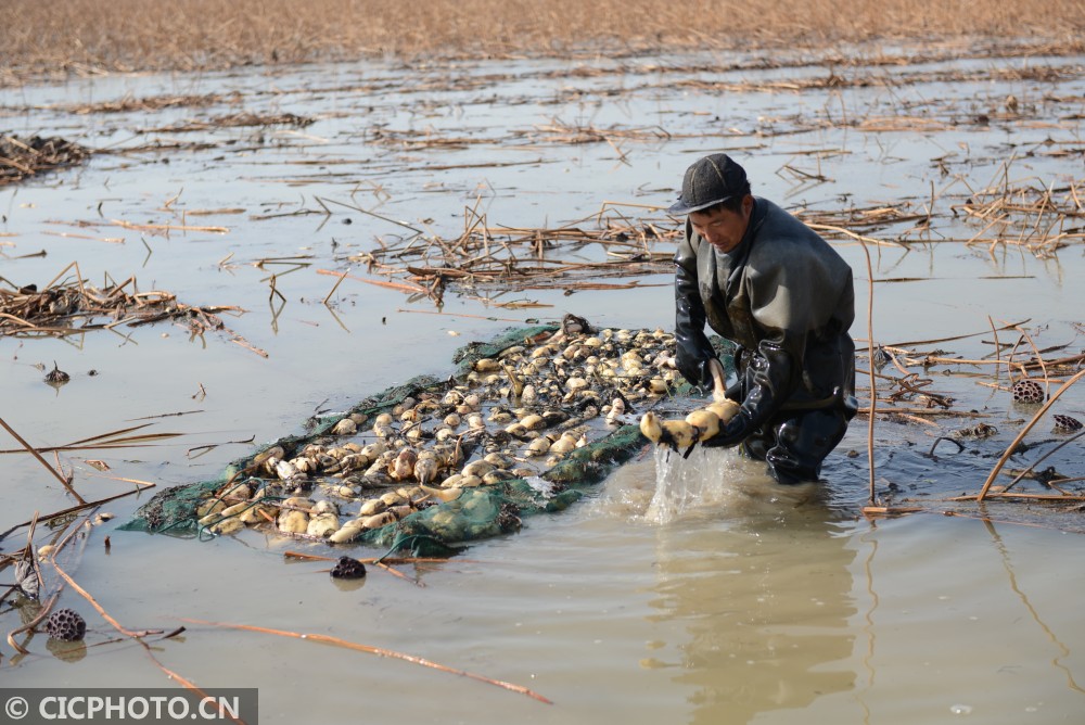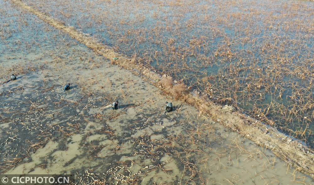 以上图片:2021年1月13日,工人在江苏省淮安市洪泽区西顺河镇水生蔬菜基地采藕。CICPHOTO/刘宇 摄
