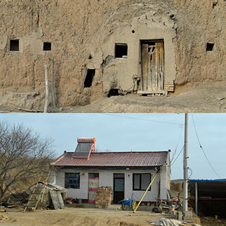 上图为周月兴家以前住的窑洞;下图为政府出资为周月兴家建的砖瓦房。新华社记者 唐如峰 摄
