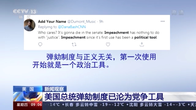 美国政治分析人士 伊恩·普赖尔:弹劾制度原来是在紧急情况下的刹车,他们却将弹劾制度变成了政治工具,这样做削弱了弹劾制度、宪法以及国会权威,因为每个人都把弹劾看成了党争笑话。