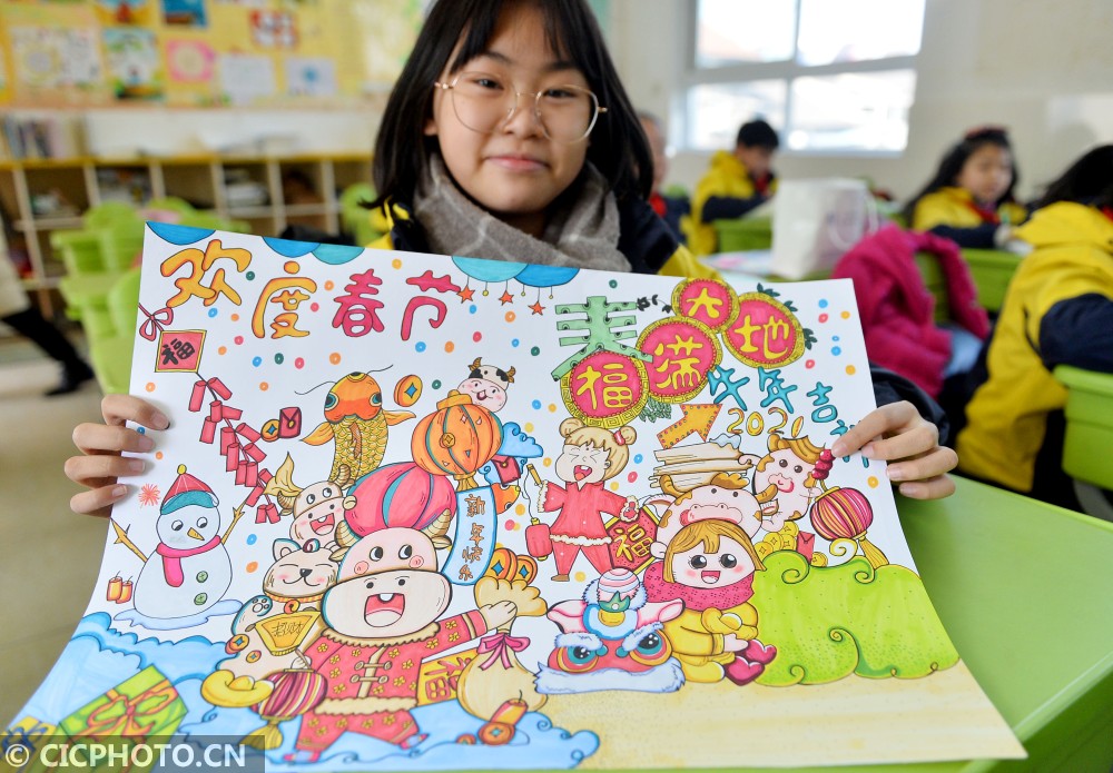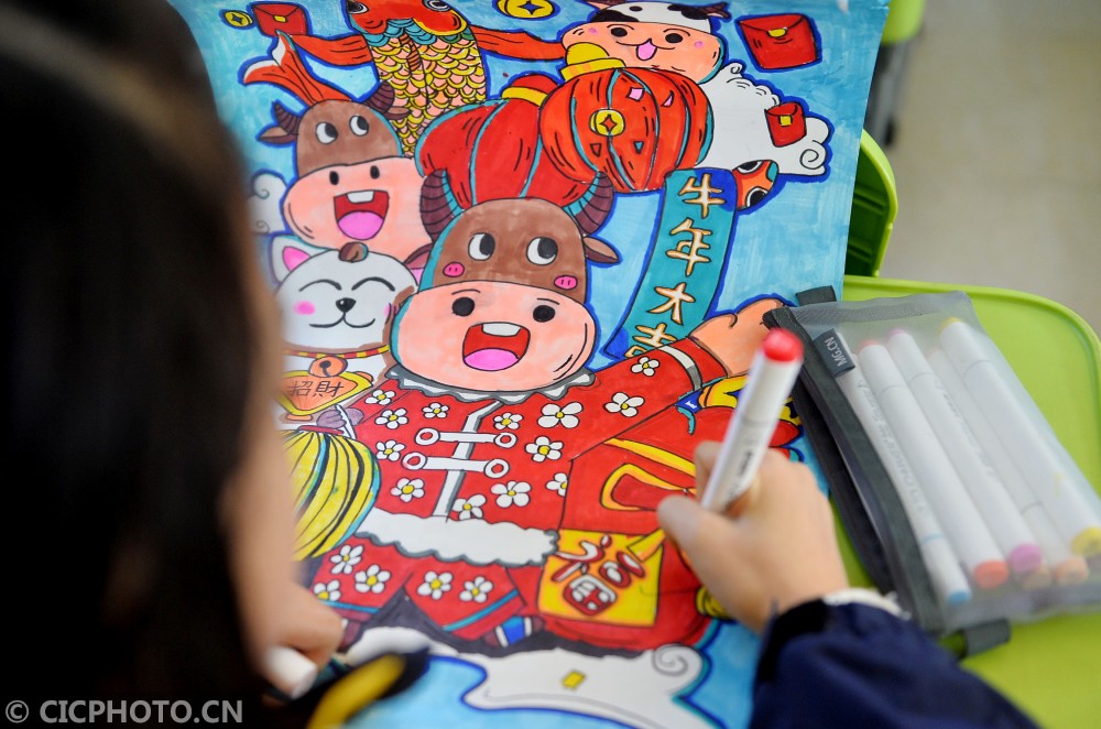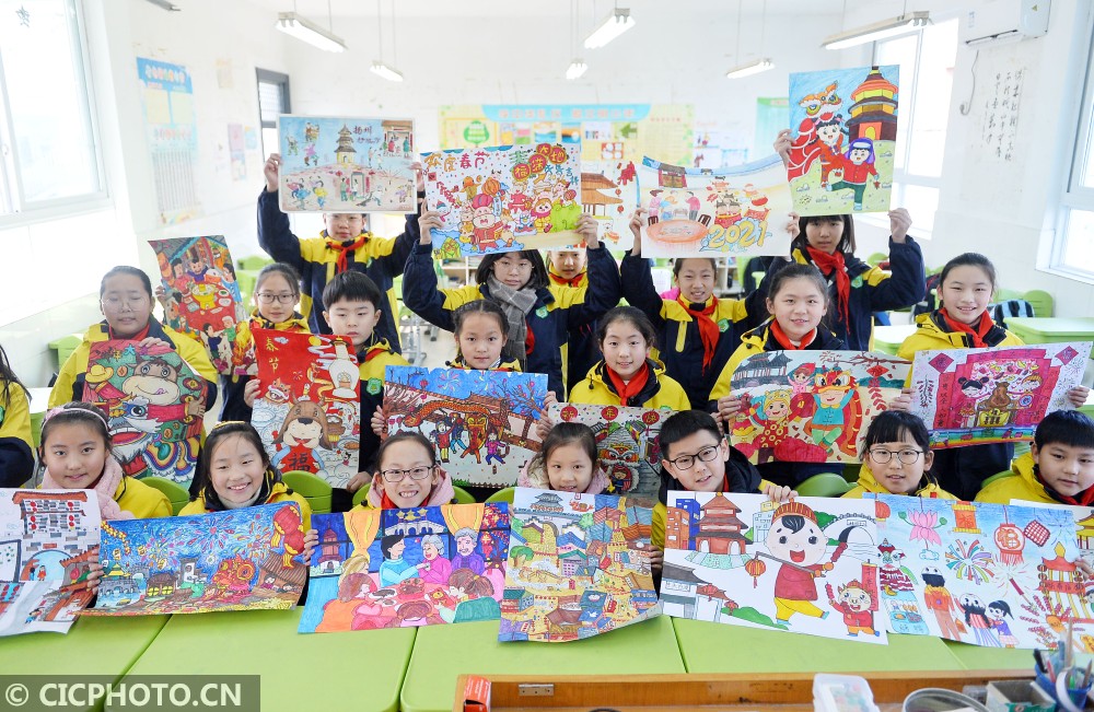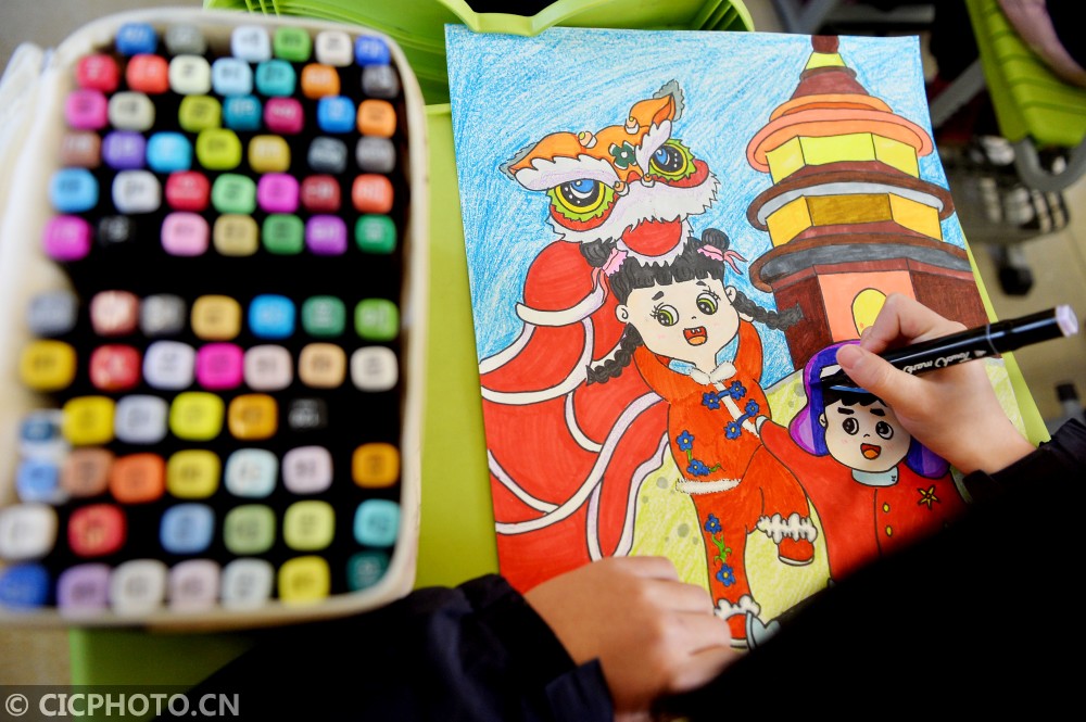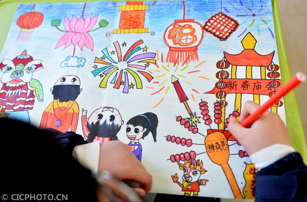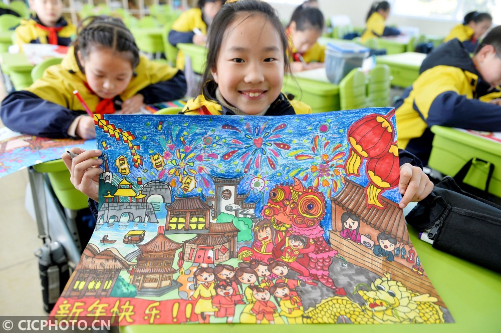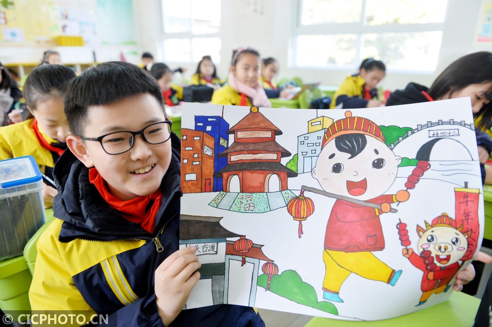 ↑江苏省扬州育才实验学校的小学生们用五彩斑斓的画笔,描绘出心中的“年味”。CICPHOTO/司新利 摄