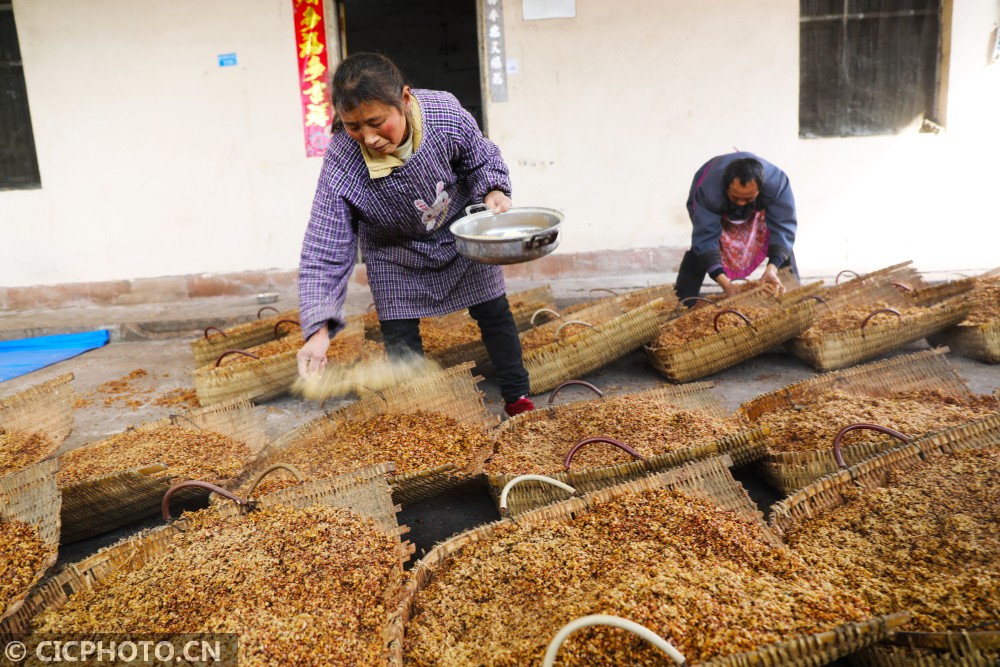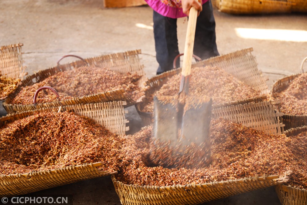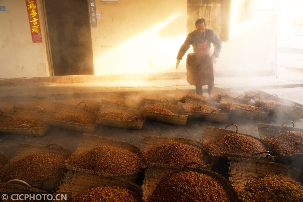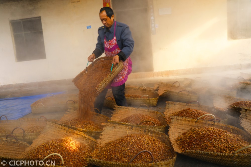 ↑2021年1月12日,重庆市梁平区石安里程村一酿酒车间,工人把蒸好的玉米、小麦、绿豆等粮食进行摊凉。CICPHOTO/刘辉 摄