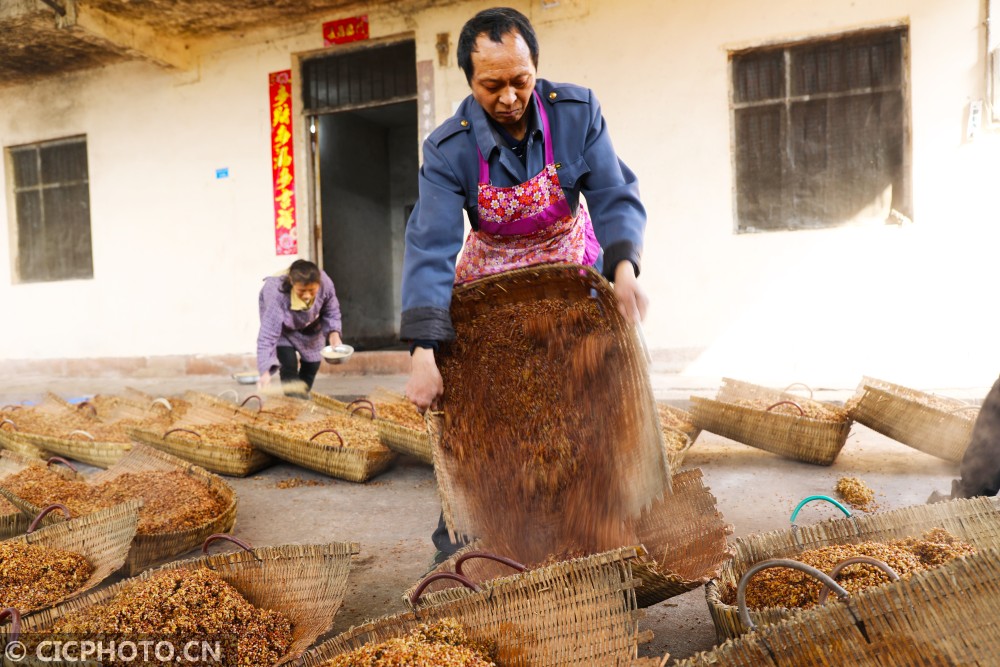 ↑2021年1月12日,重庆市梁平区石安里程村一酿酒车间,工人在用铁铲对蒸好的玉米、小麦、绿豆等粮食进行摊凉。CICPHOTO/刘辉 摄