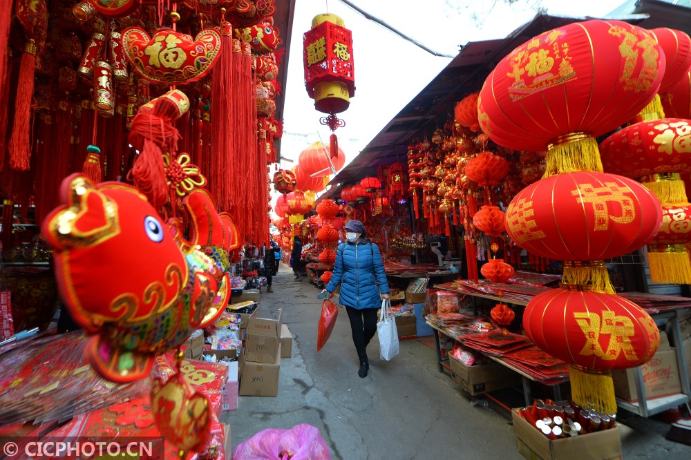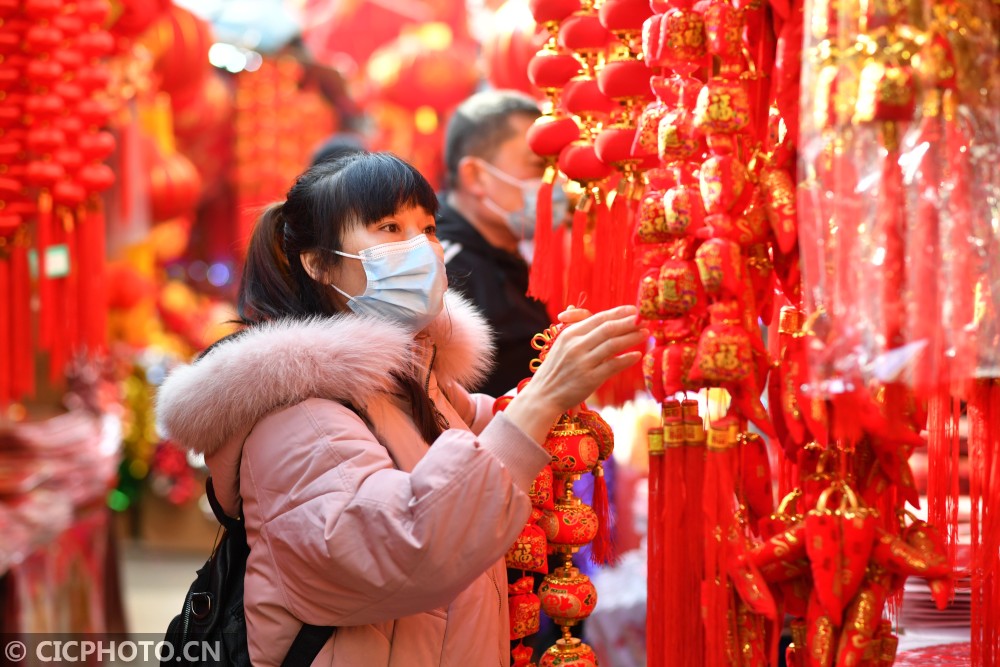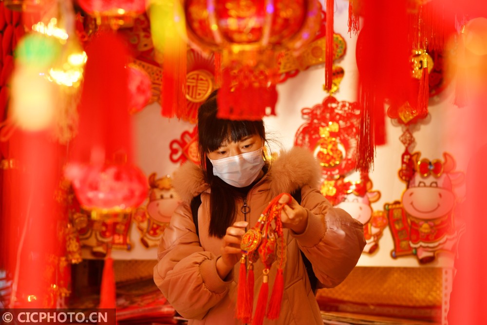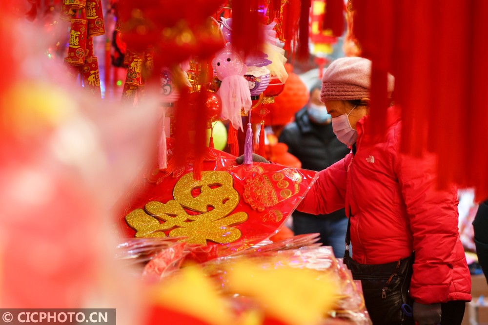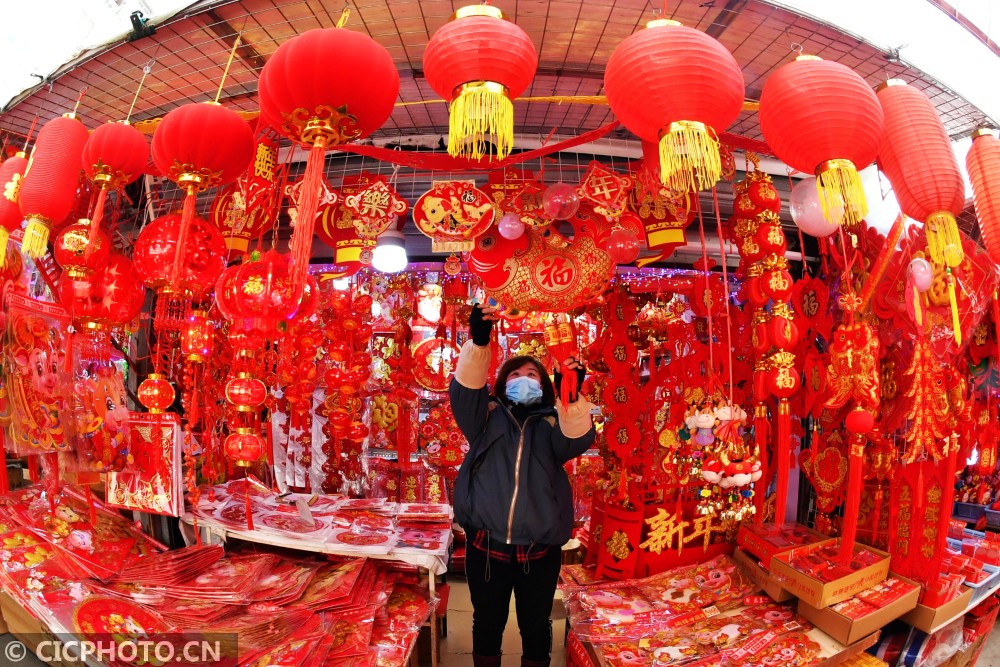 2021年1月13日是农历腊月初一,在山东省青岛市一处小商品批发市场,火红的氛围带来浓浓的年味,人们开始选购过年用品,迎接2021年春节的到来。