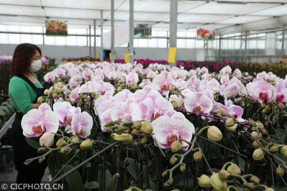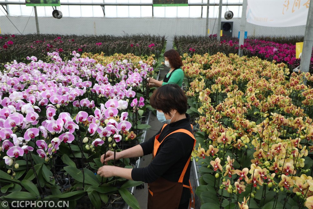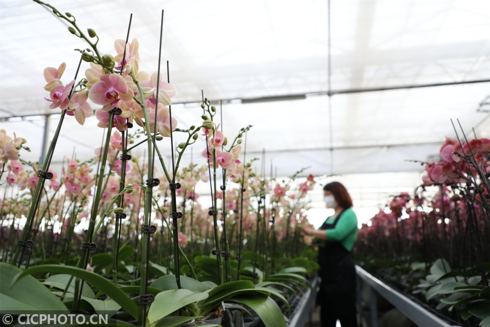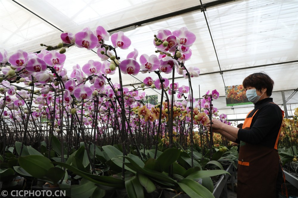 ↑2021年1月13日,山东省滨州市博兴县一农业科技公司员工在管护由“生物组培技术”培育盛开的蝴蝶兰。CICPHOTO/陈彬 摄