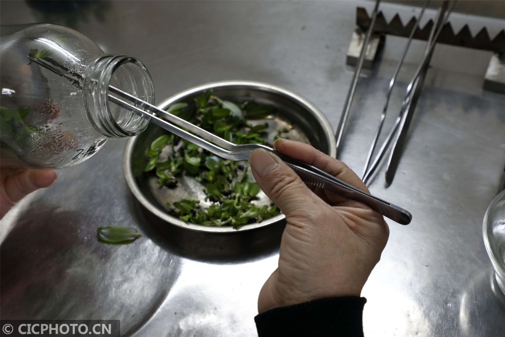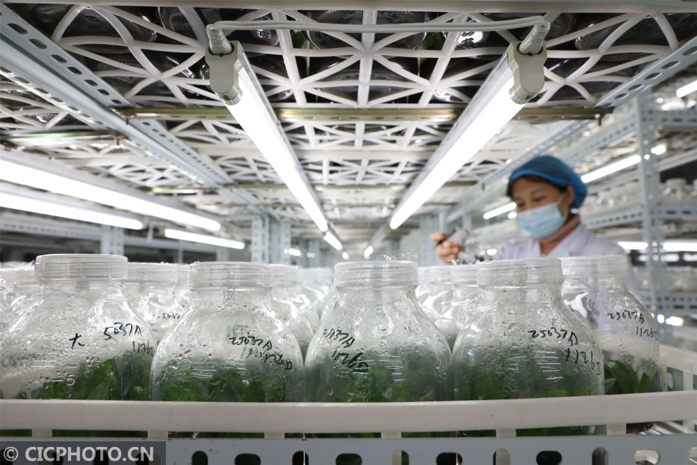 ↑2021年1月13日,山东省滨州市博兴县一农业科技公司员工使用“生物组培技术”在对蝴蝶兰种苗进行组培转接。CICPHOTO/陈彬 摄