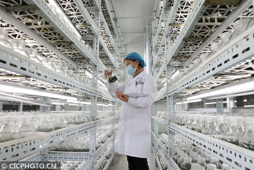 ↑2021年1月13日,山东省滨州市博兴县一农业科技公司技术人员在查看由“生物组培技术”培育的蝴蝶兰种苗生长情况。CICPHOTO/陈彬 摄
