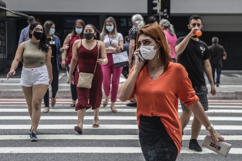 2021年1月11日,人们在巴西圣保罗街头过马路。新华社发(拉赫尔·帕特拉索摄)