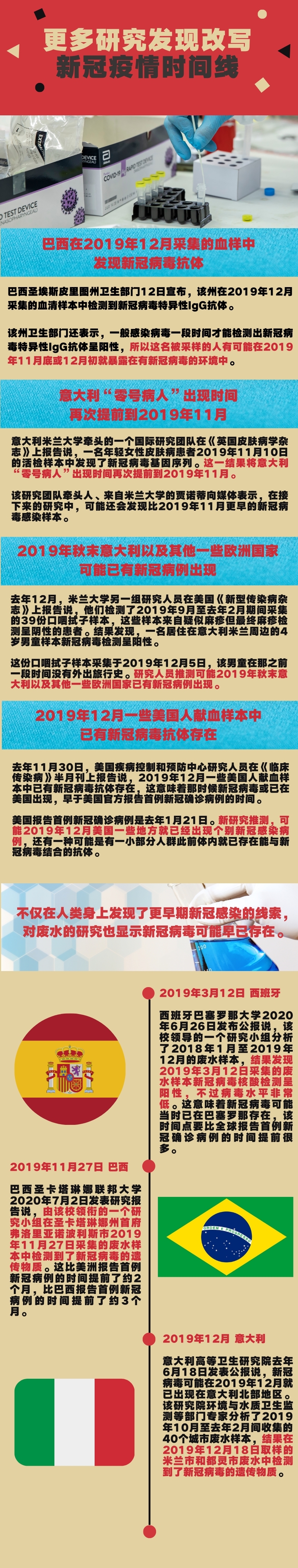 在此之前,美国、意大利也都在人类身上发现更早期新冠感染的线索,多国对废水的研究也显示新冠病毒可能早已存在。