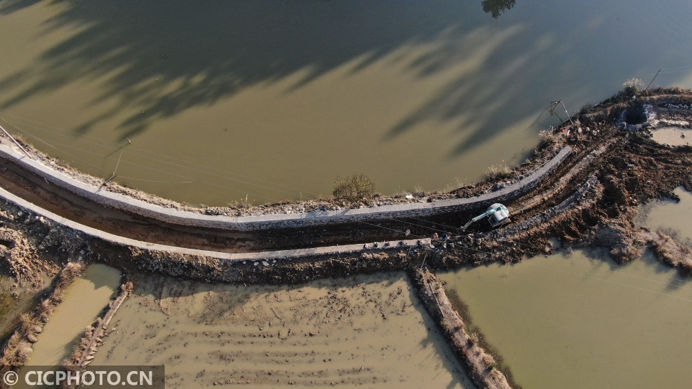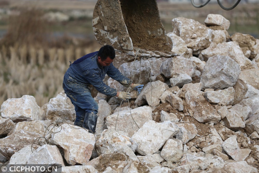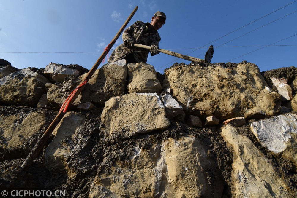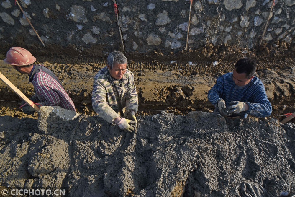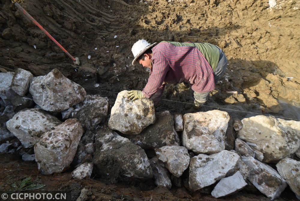 以上图片:2021年1月13日,在贵州省锦屏县敦寨镇亮司村水利冬修施工现场,施工人员在扩建灌溉渠道。CICPHOTO/杨晓海 摄