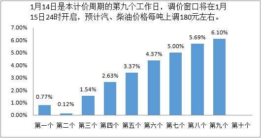 受国际油价走高带动,本周期一揽子原油平均变化率正向运行,且幅度趋于扩大。新华社石油价格系统1月14日发布的数据显示,1月13日一揽子原油平均价格变化率为6.10%,据此测算,预计本轮成品油价将上调180元/吨左右。