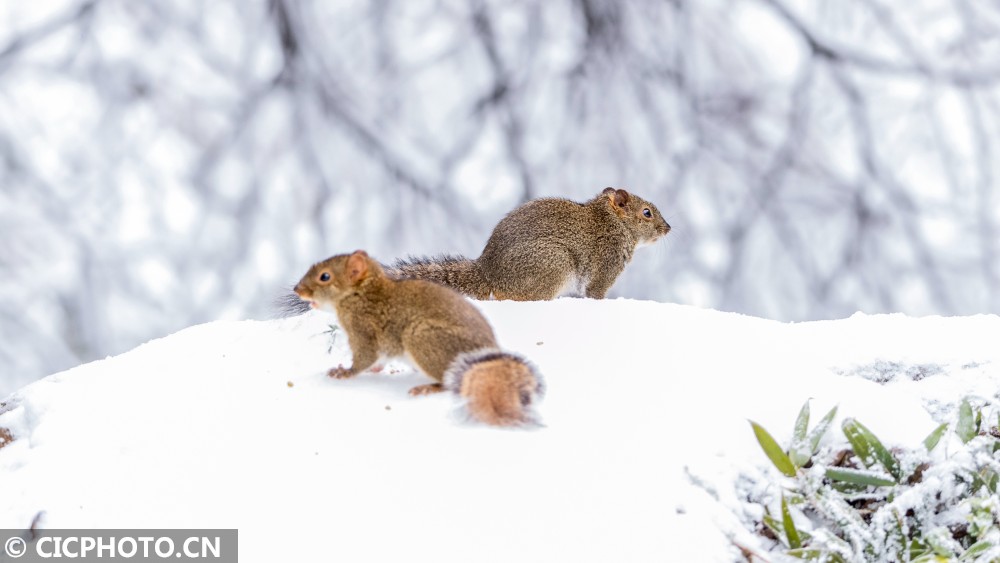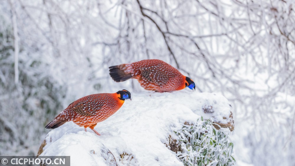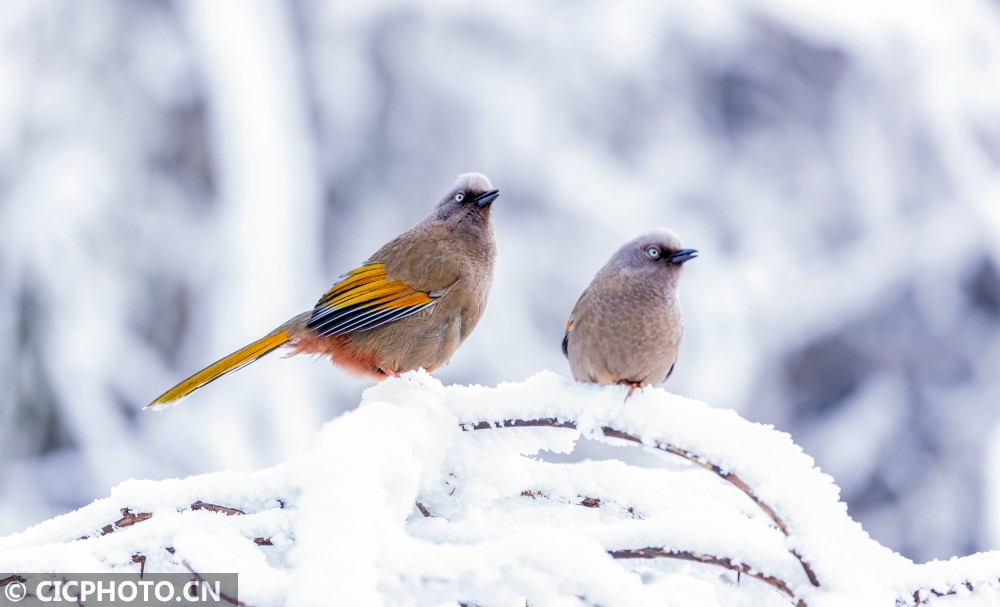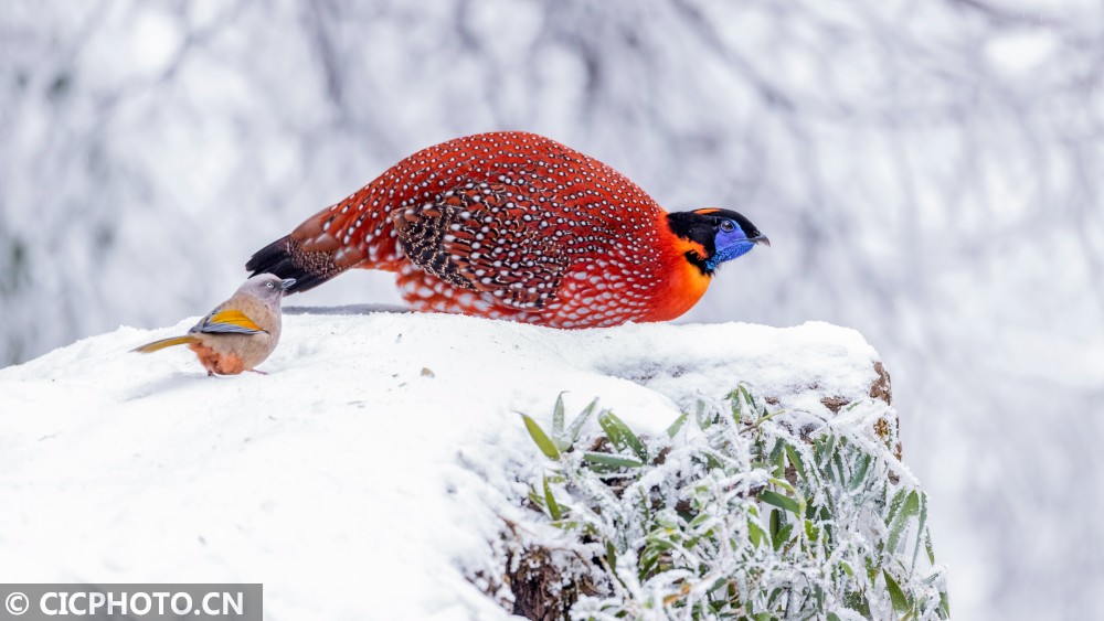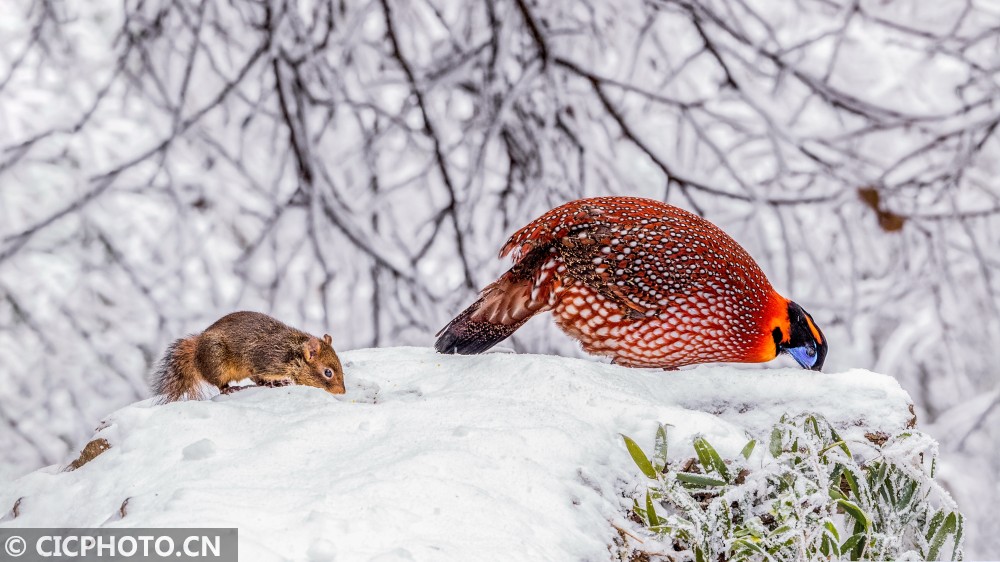 近日,位于重庆市南川区金佛山景区连降瑞雪,红腹角雉、橙翅噪鹛和松鼠在皑皑白雪中或栖息、或觅食,宛如雪中精灵。
