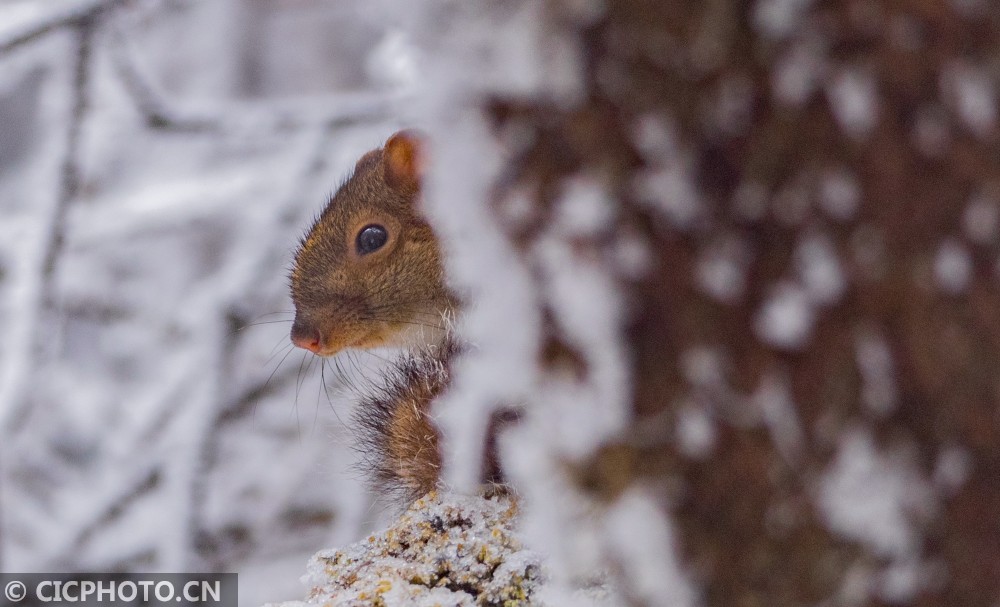 ↑2021年1月12日,松鼠在重庆市南川区金佛山景区觅食。CICPHOTO/瞿明斌 摄