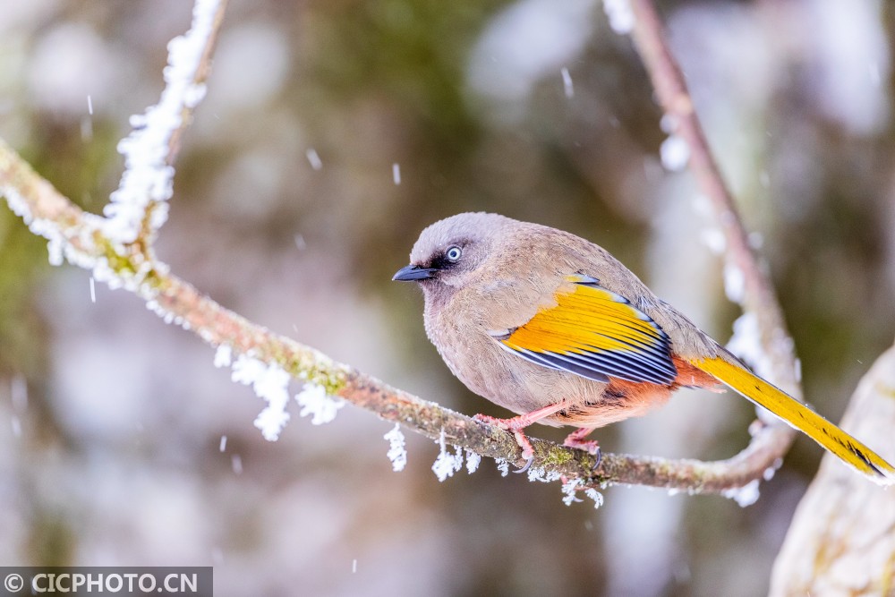 ↑2021年1月12日,橙翅噪鹛在重庆市南川区金佛山景区栖息。CICPHOTO/瞿明斌 摄