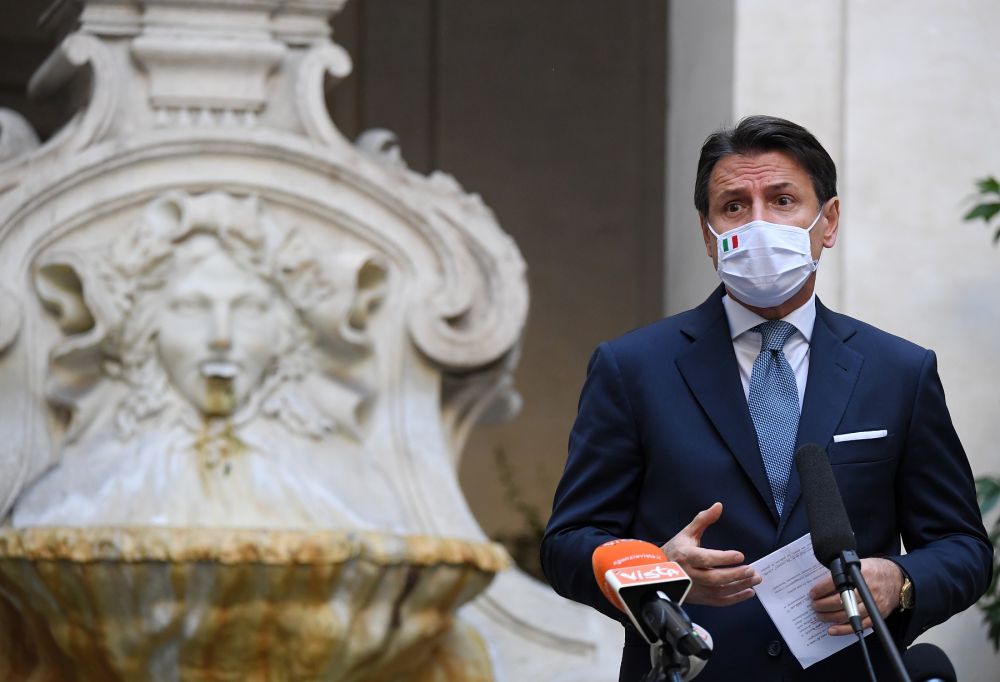 2020年10月13日,意大利总理孔特在罗马举行的新闻发布会上发表关于新防疫措施的讲话。(新华社发,阿尔贝托·林格利亚摄)