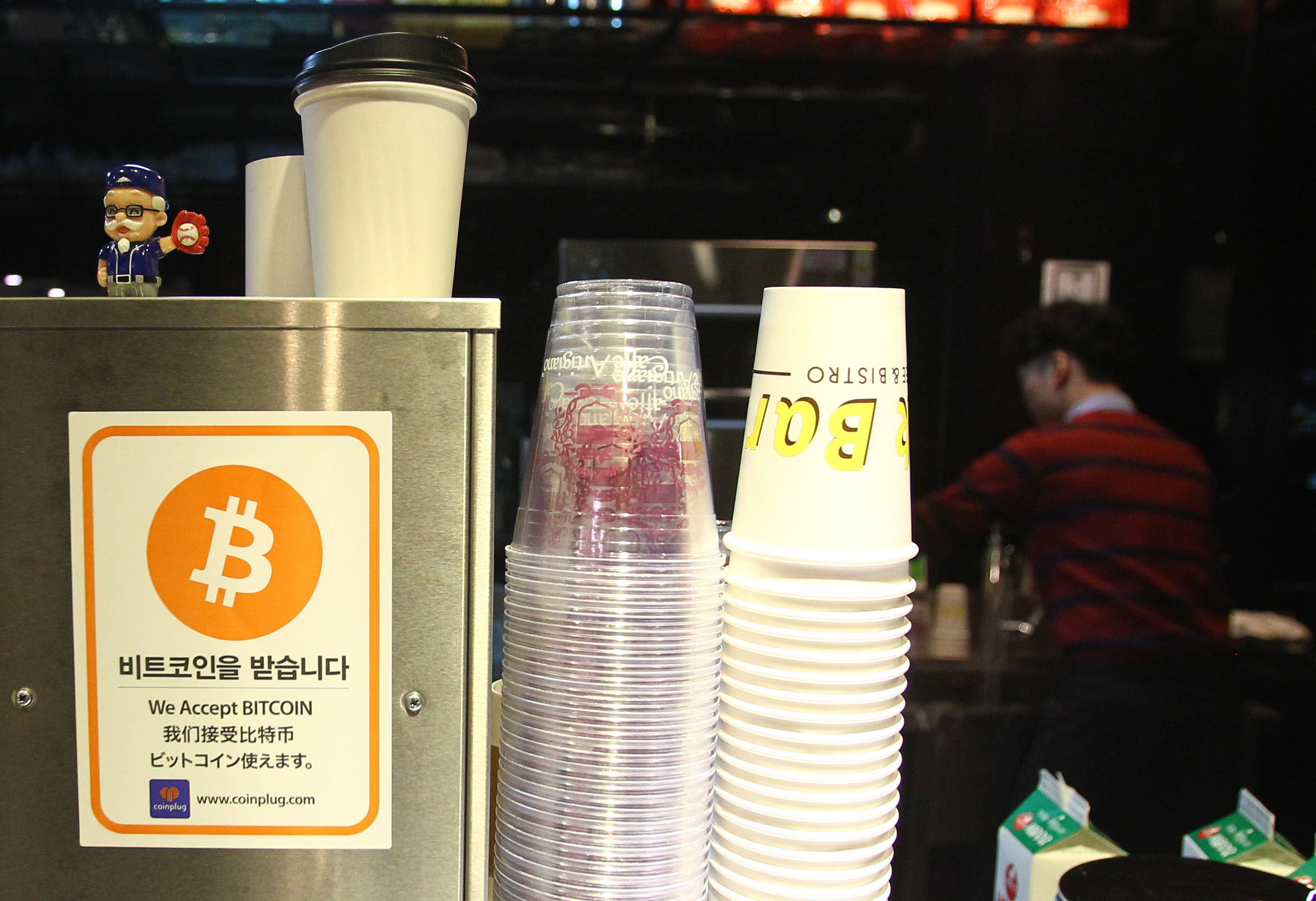 图为韩国首尔一家咖啡厅张贴可以使用比特币交易的标志。(新华社记者姚琪琳摄)