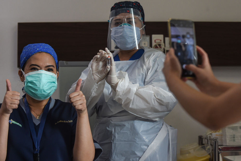1月14日,在印度尼西亚雅加达的一家医院,一名医卫工作者(左)在接种中国科兴公司的克尔来福新冠疫苗前留影。(新华社发 阿贡摄)
