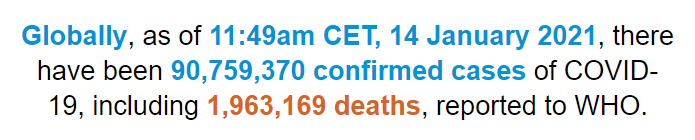 根据世卫组织最新实时统计数据,截至欧洲中部时间1月14日11时49分(北京时间1月14日18时49分),全球累计新冠肺炎确诊病例90759370例,累计死亡病例1963169例。