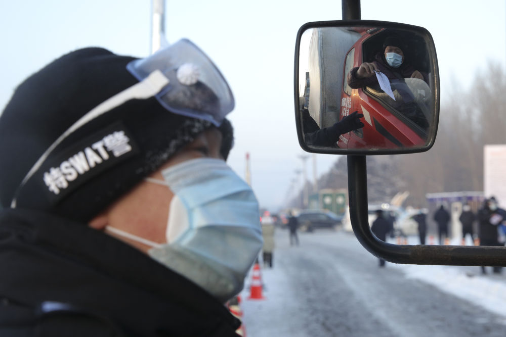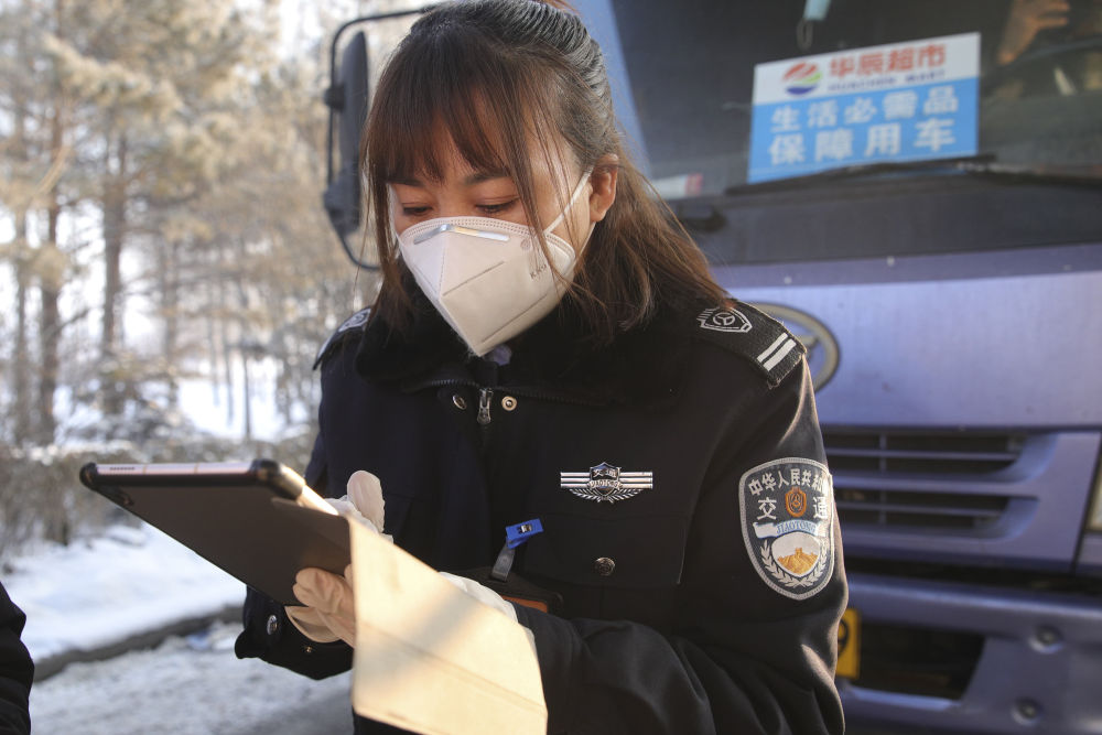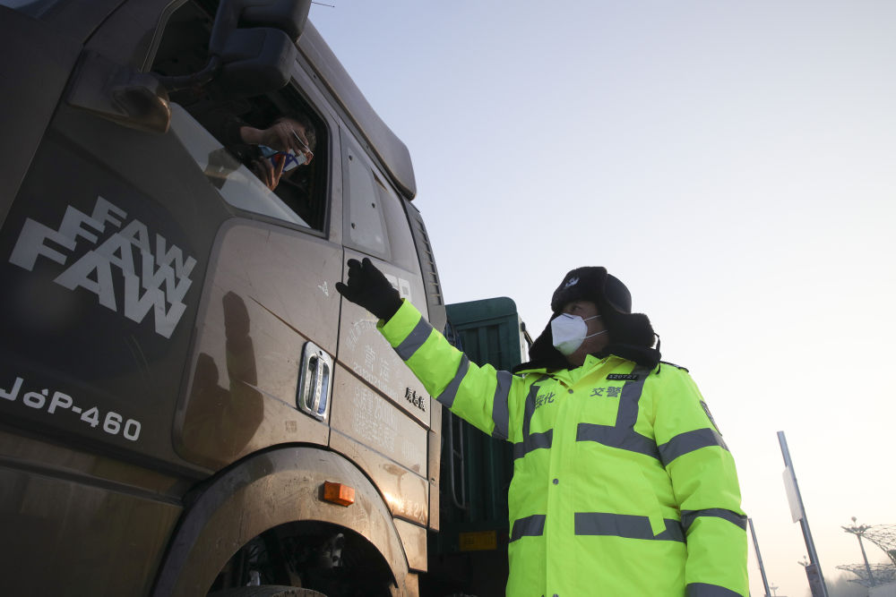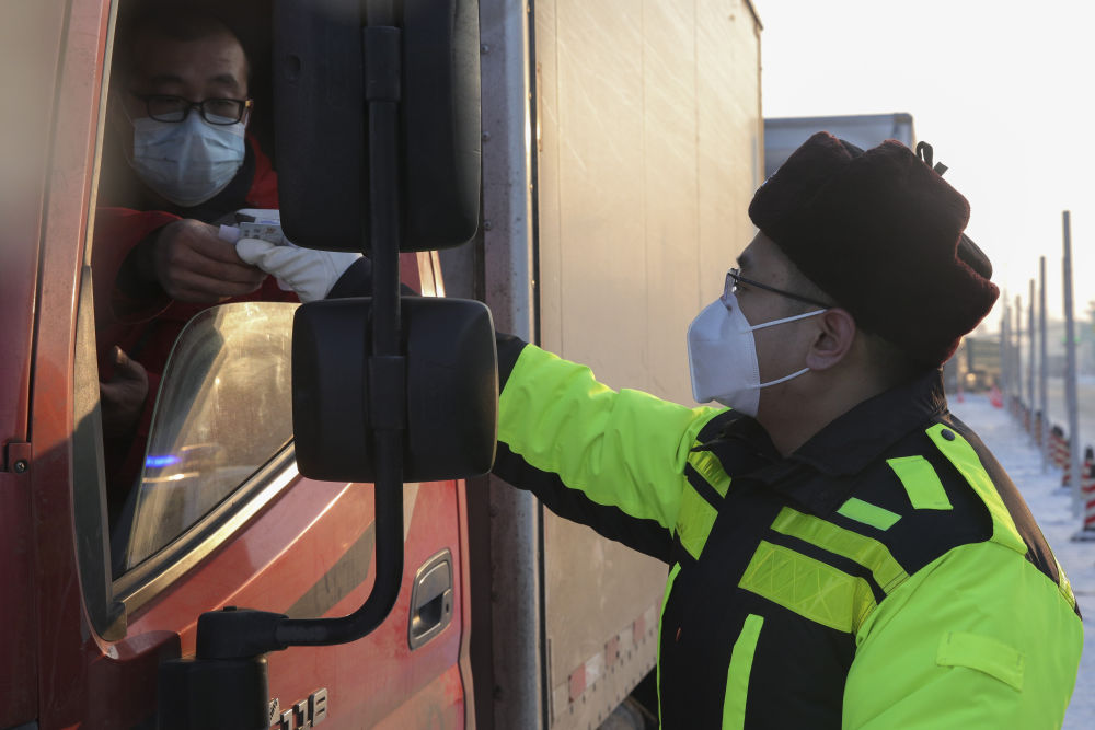 ↑1月14日,工作人员在绥化市城南高速口入城处对入城司机进行信息核查。