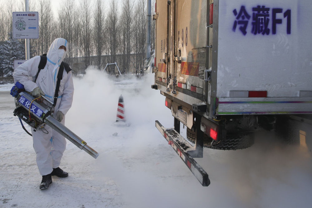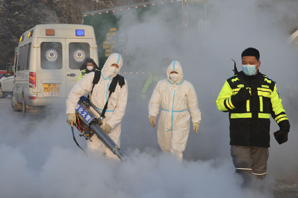 ↑1月14日,绥化应急救援队工作人员在绥化市城南高速口入城处进行消杀作业。