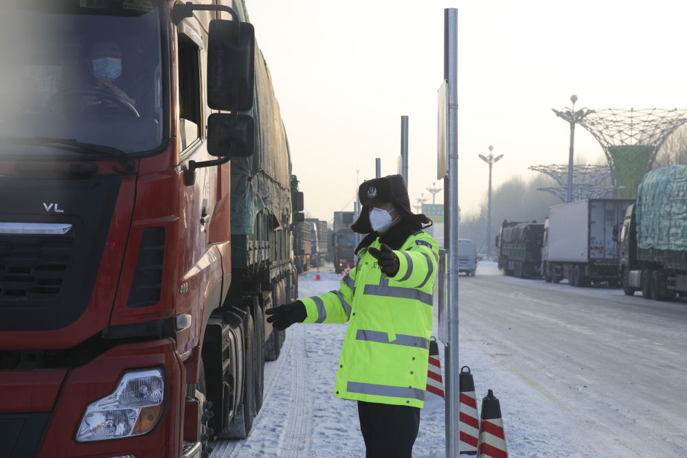 ↑1月14日,绥化市交警支队执勤交警在绥化市城南高速口入城处对司机进行信息核查。