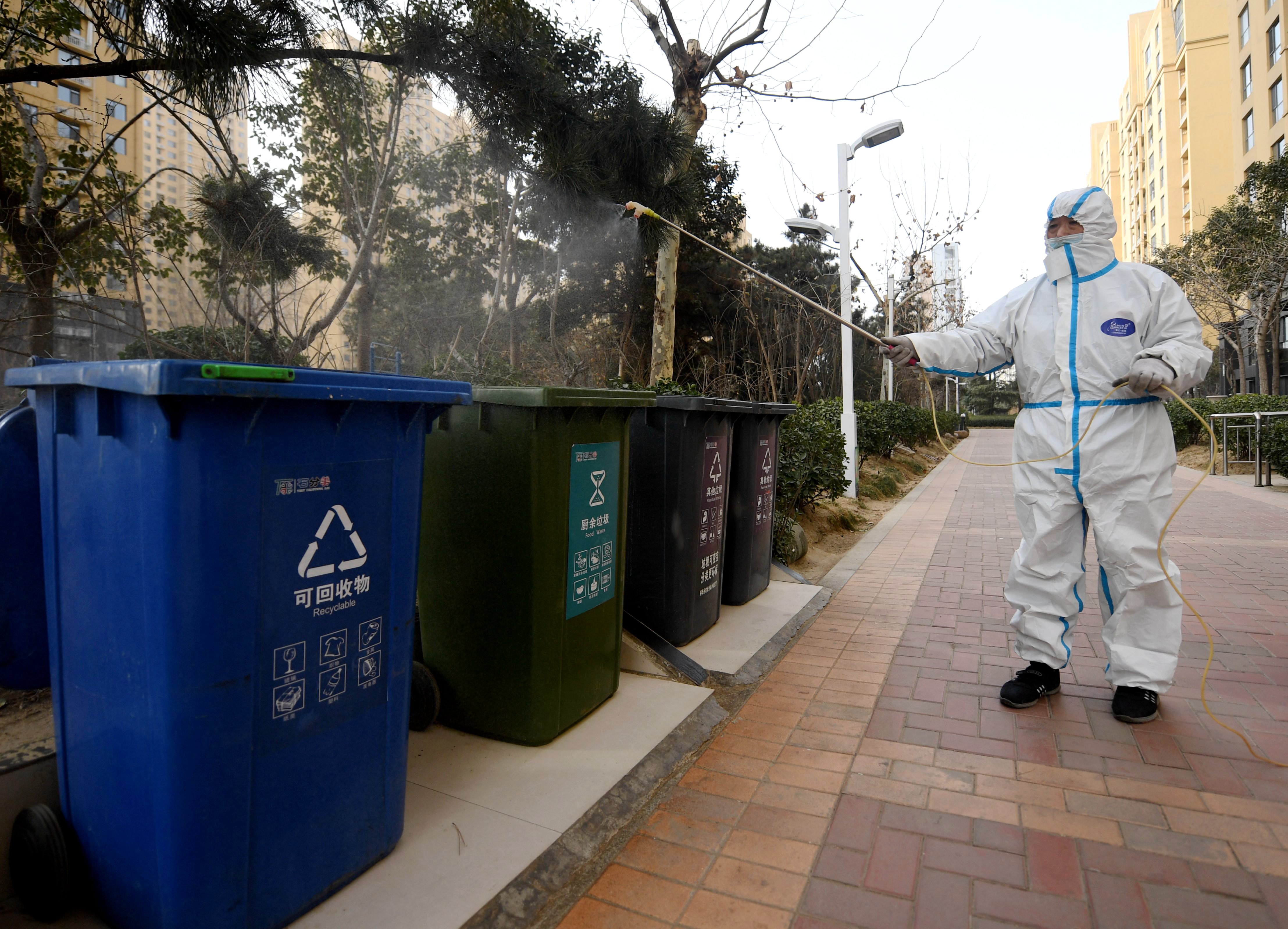 1月12日,工作人员在石家庄市中风险小区内消杀。新华社记者 王晓 摄
