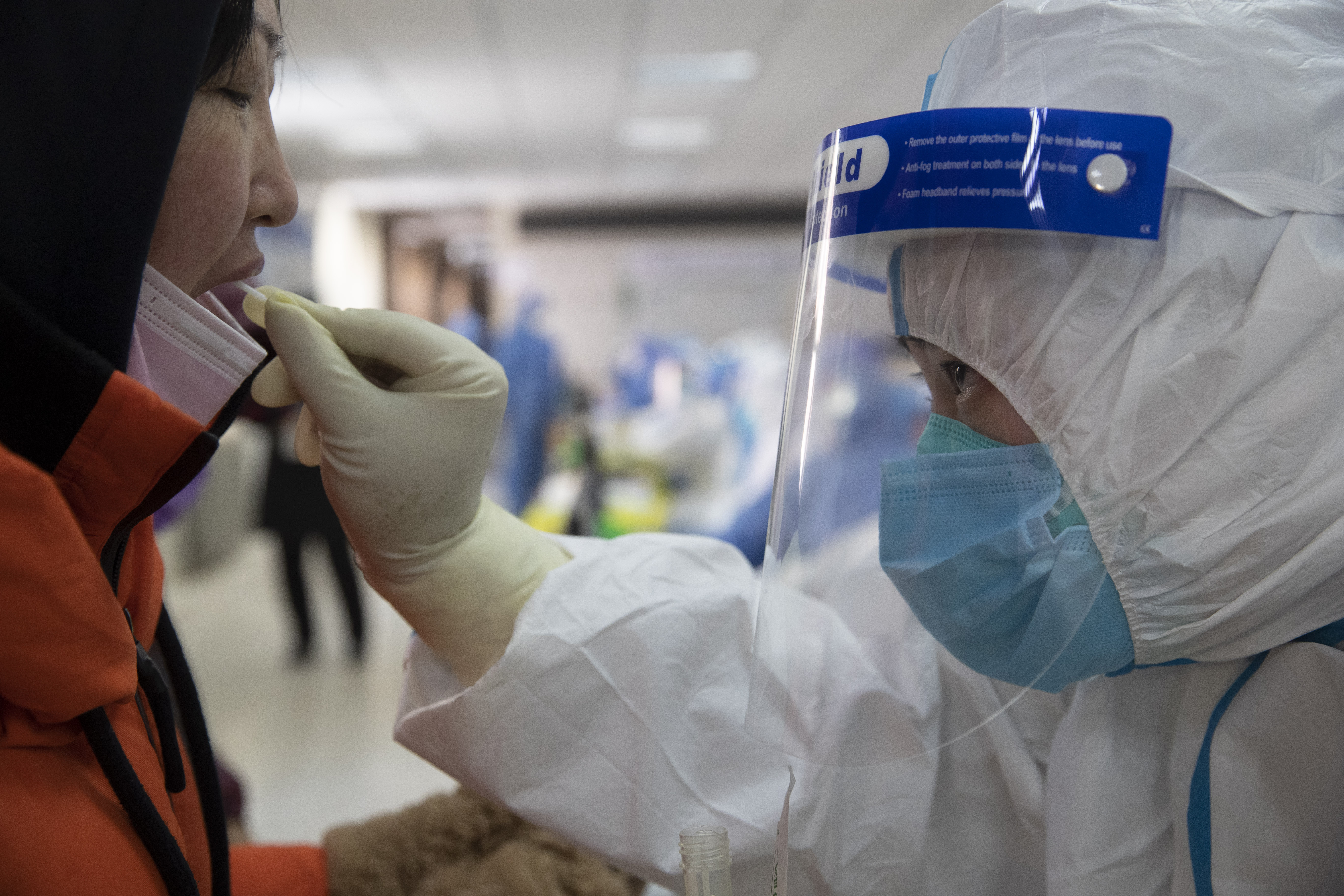 1月14日,医务人员在哈尔滨市香坊区和平街道办事处亚麻社区核酸采集点采样。新华社发(张涛 摄)
