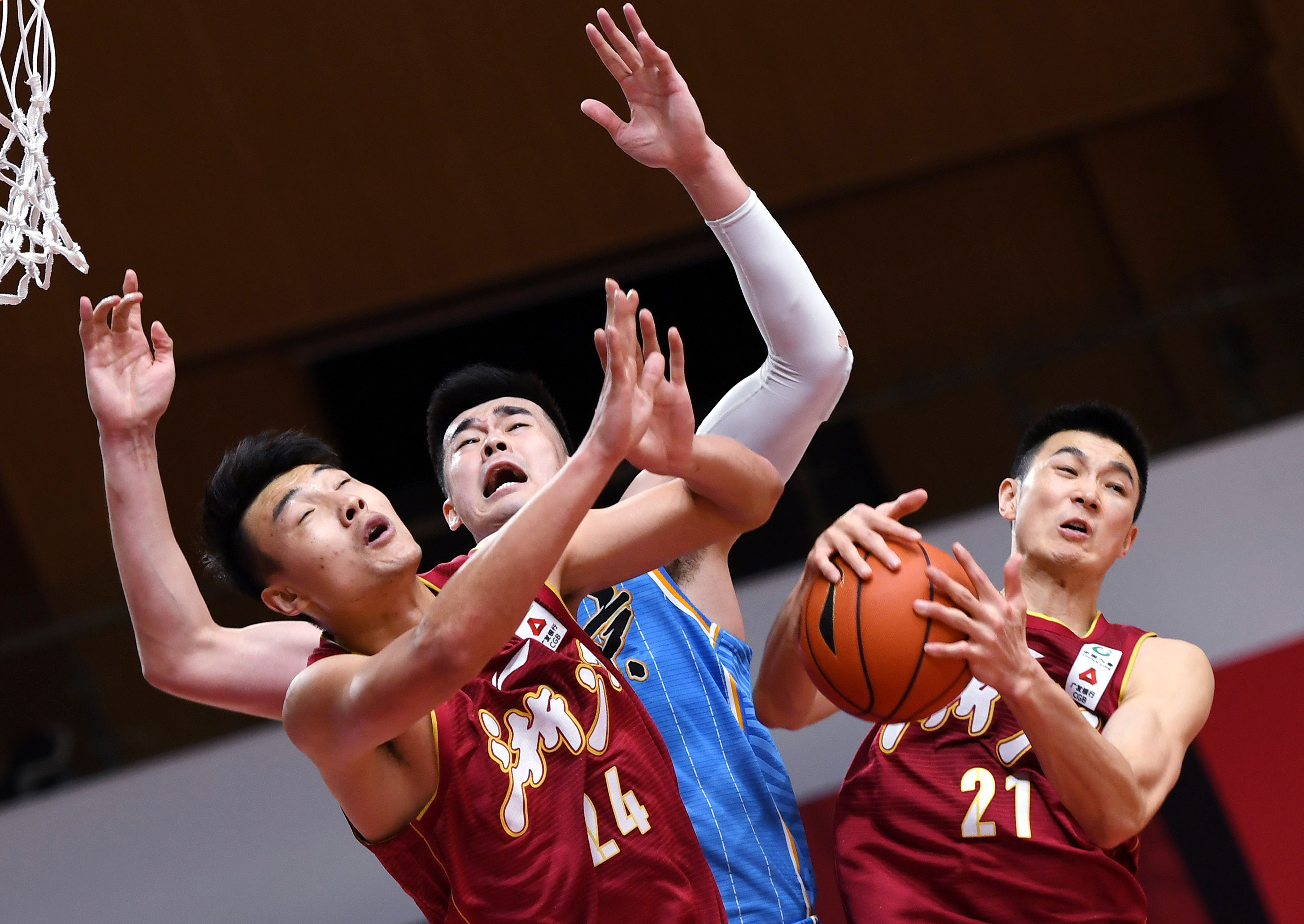 北京首钢队球员李慕豪(中)与浙江稠州金租队球员朱旭航(右)、张大宇拼抢。新华社记者李紫恒摄