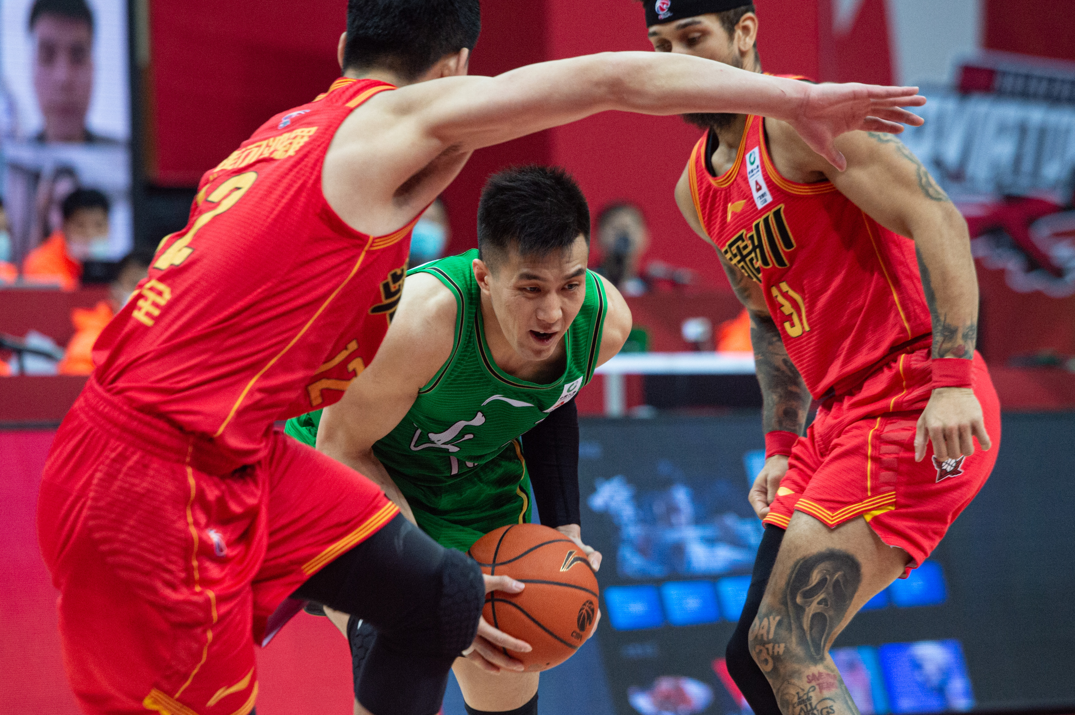 辽宁本钢队球员郭艾伦(中)在比赛中突破深圳马可波罗队球员顾全(左)、布克的防守。新华社发(江汉摄)