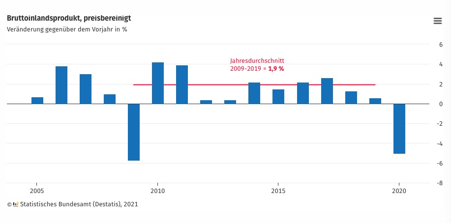 根据德国联邦统计局当地时间14日发布的初步数据,2020年德国国内生产总值下滑5%——在经历了连续10年的经济增长后,首次陷入衰退,创下1945年以来的第二大跌幅。不过,由于政府祭出空前规模的救助和刺激措施,去年德国经济的萎缩程度仍低于分析人士预期的5.2%,也好过2009年全球金融危机期间德国经济5.7%的跌幅。