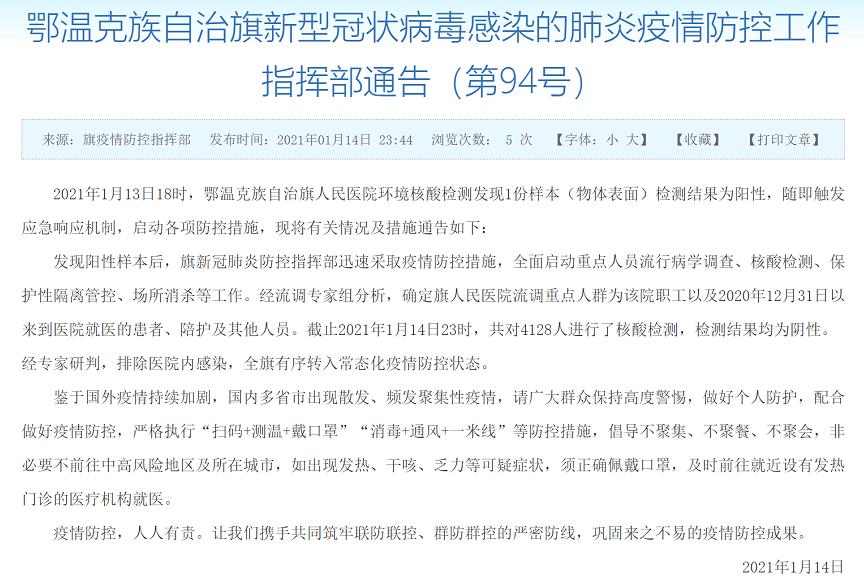 1月15日,内蒙古鄂温克族自治旗新冠肺炎疫情防控工作指挥部发布通告,2021年1月13日18时,鄂温克族自治旗人民医院环境核酸检测发现1份样本(物体表面)检测结果为阳性,随即触发应急响应机制,启动各项防控措施,现将有关情况及措施通告如下: